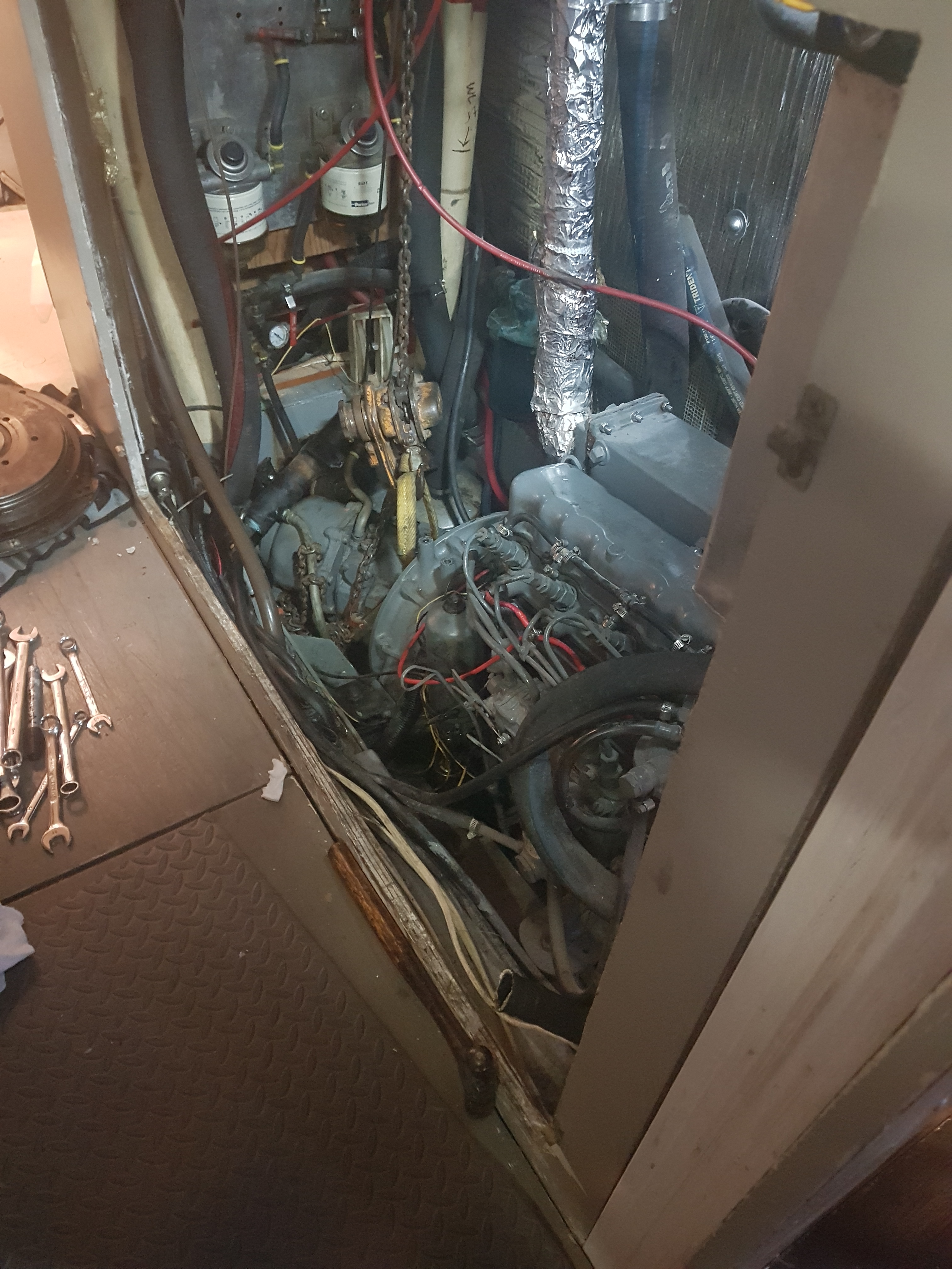 Meantime, the engine was pulled today!!! Yep, our boat is without a heart right now… the new engine will be arriving next week and then we will need to do the whole process in reverse! A new engine was not originally on our purchasing list and deciding to buy it was tough – it is a big chunk of money we didn’t think we would spend. Owen was worried about new strange sound it was making and compression tests suggested not all was right. Well thank heavens we ordered it a couple of months ago as we fired it up last Sunday only to have it run for a few minutes before dying – Owen tried to restart it only have a horrific metal grinding noise instead of a running engine – catastrophic failure!!!
