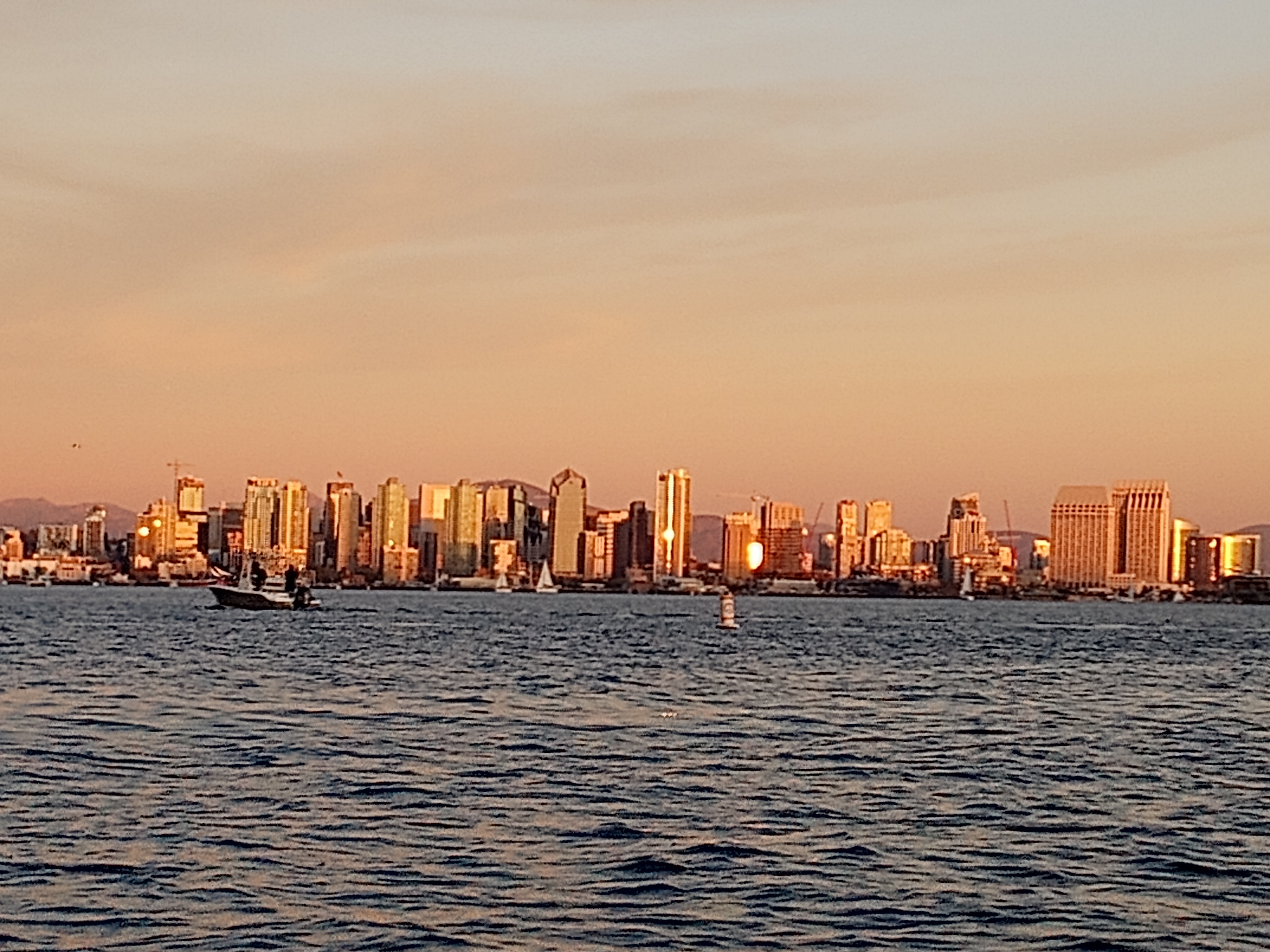 Having left Avalon mid-day, we sailed through the night in very light winds – every once in a while we would get a teaser of a wind increase, the boat would take off and almost immediately we would sail out of the wind! We were finally approaching San Diego early morning and mistakenly came in fairly close to shore – in the midst of the thickest seaweed we had ever seen (the nice stringy stuff that might as well be ropes!) and a field of crab traps. Navigating through the traps literally required me calling instructions for Owen to go left and right at very quick intervals. Once we made it through that, we made our way to the Harbour Police Dock where were required to have our boat inspected prior to being permitted to anchor in the A9 anchorage.