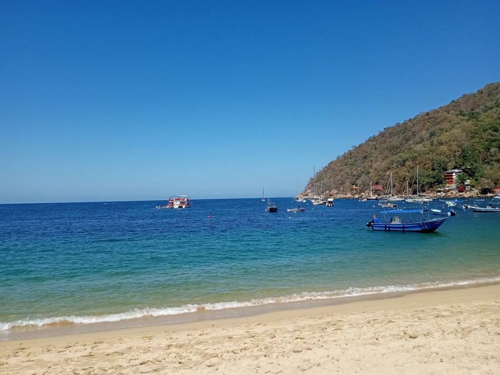 We got away a little after noon on Monday, after Owen, Linda and Harvey made a trip to the Port Captain to check us out and to add them to our crew list. Our first destination was Yelapa, an afternoon’s sail across Banderas Bay. We arrived just at dinner time and were guided to a mooring ball. It didn’t take to long to figure out that this was not going to be a really comfortable night – Yelapa is exposed to the swell coming in from Banderas Bay and as soon as the afternoon wind stopped, we turned sideways into the swell and were rocking from side to side. Linda was feeling the motion pretty quickly but stayed on deck and seemed to manage to keep her spirits up. I was below trying to make dinner, alternately trying to hold the plates in place and fighting my own queezyness!!! When my freshly made Chimi-churri dumped into the sink, spilling all the contents all over the dishes, I nearly cried!!! We managed to eat dinner without any other mishaps and everyone headed to bed early, mostly in hopes that the rocking would lull us to sleep rather than driving us crazy!!! We had actually intended to leave the next day but we really, really wanted to visit Yelapa so instead crossed our fingers that night two wouldn’t be so bad and called for the water taxi to take us to shore. Yelapa is very isolated – in our original reading we had understood that there was no road in and everything arrived by water. In fact there is a very crude road into the community, but old habits die hard and pretty much everyone and everything still arrives by water. In the old days, the supplies, food and even people who were arriving would be transported up the rather steep streets of town on donkeys – unfortunately the mighty ATV has now mostly replaced the donkeys but it was pretty easy to picture them when we were wandering in and around the narrow, winding, cobblestone streets!!! We enjoyed breakfast on the beach, watching a steady stream of tour boats arrive, barely finish a drink and be rounded up again for the next part of their tour. We were sure happy to be doing this at our own pace!!! We followed the hoards of people up the hill to the waterfall behind town. When we arrived there was a huge tour group – all doing quasi-photo shoots in the pool underneath the waterfall (that tour guide missed his calling!) and we reluctantly joined the throngs. But then, we heard the “boat 5 let’s go” and just like that we were the only people there!!! We explored a bit more of the town and then headed back to the beach for a round of Pina Coladas and then got the water taxi back to the boat for the night. Night two was quite a bit more settled and pleasant, thankfully!!!