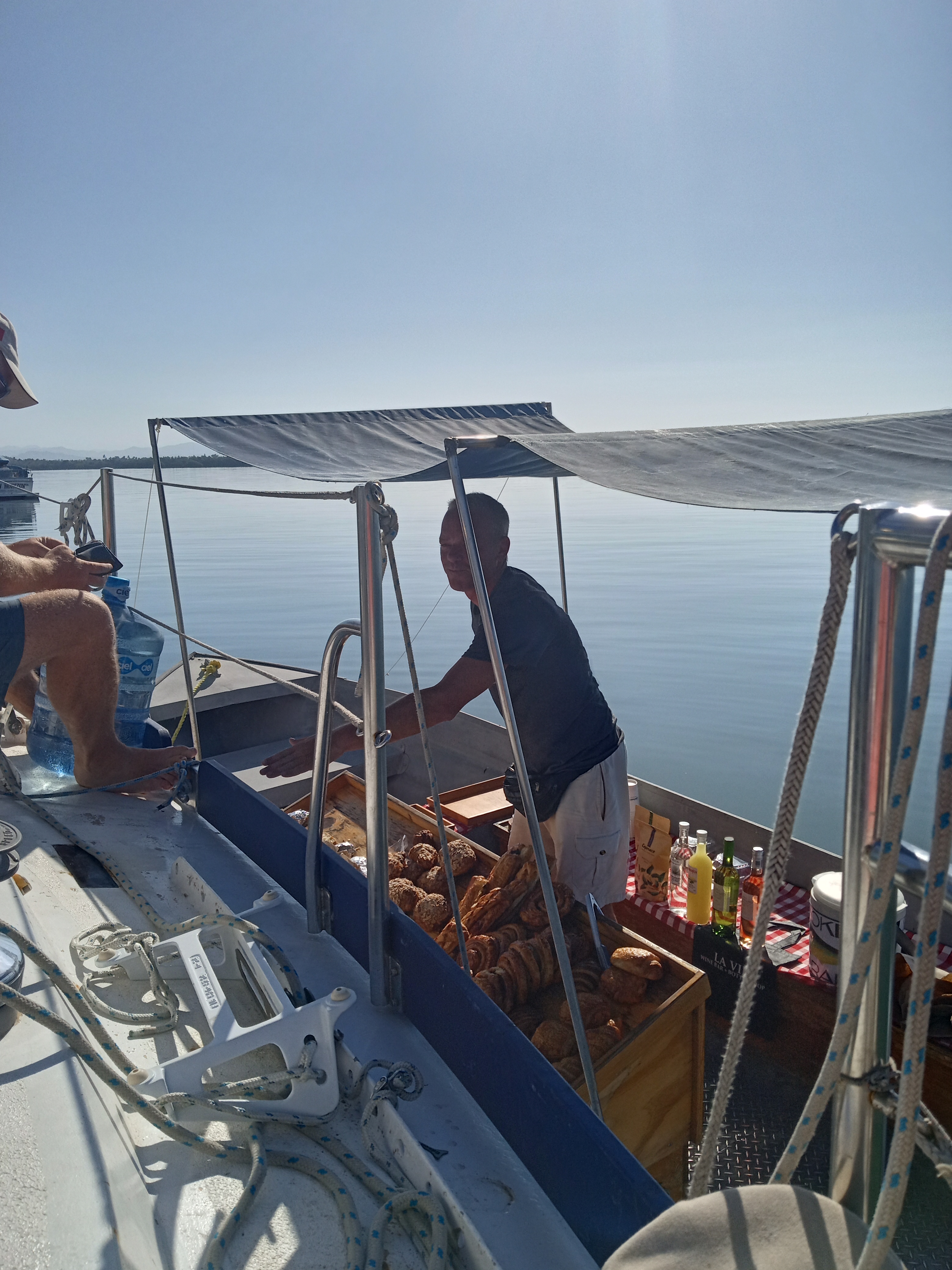 The next day started off on a high note as the French Baker arrived in the lagoon. We had heard tales of this wonderful event but weren’t sure we believed them. But then, sure enough, just after the morning net we hear “zis is the zee French Baker entering zee Lagoon” over the radio – we anxiously starting watching for him and were so excited to see the panga, decked out with display tables of fresh baked pastries, coffee urns and even bottles of wine, approach. We all chose a treat to enjoy for breakfast.