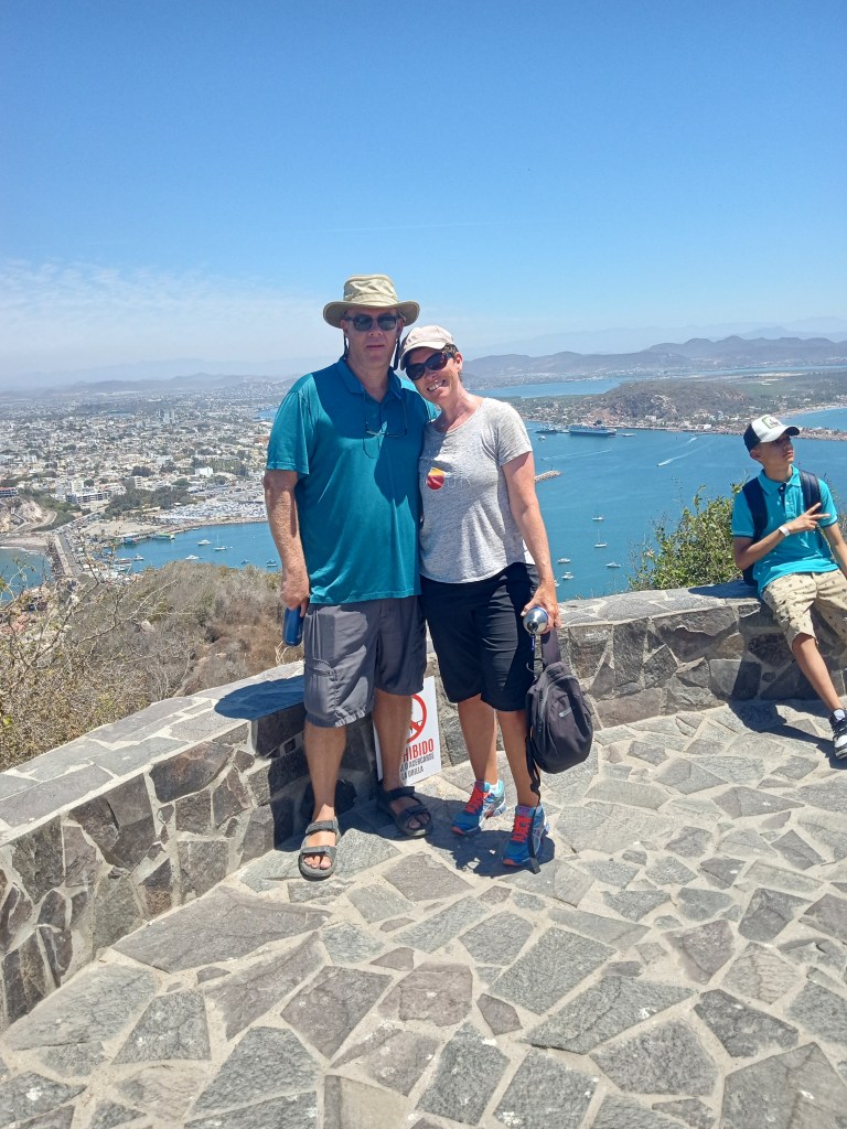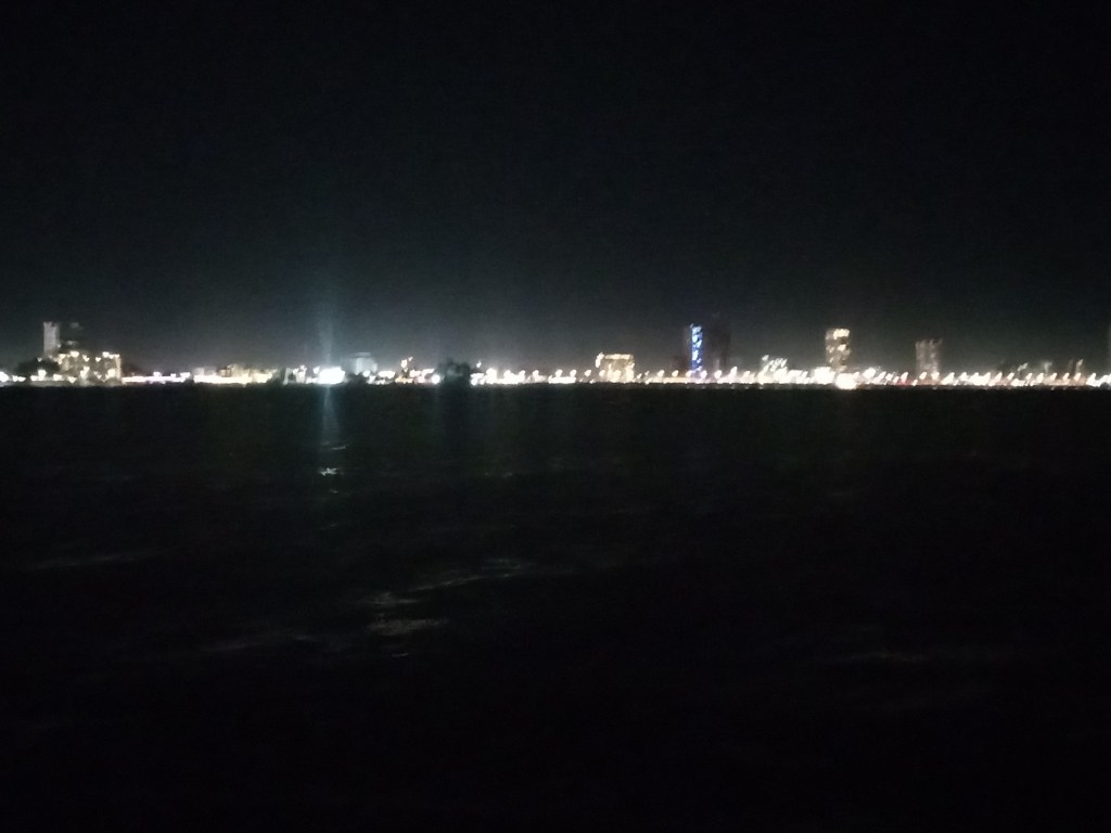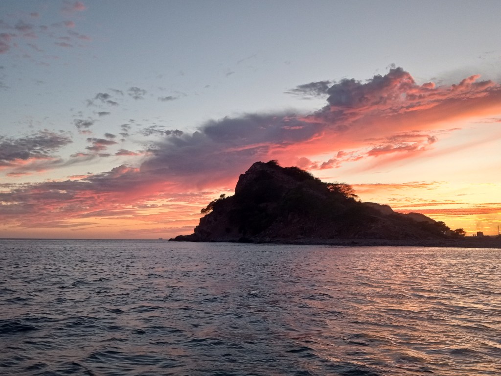 As our intention was to leave the next day to head over to La Paz and the fuel docks are at the Marina District, about 8 miles north of the old harbour, we decided to move the boat up to the Islands near the Marina entrance. We arrived there mid-afternoon and anchored amongst all of the party boats. Owen scraped tons of barnacles off of the hydro-vane rudder and gave the water line a quick scrub – all the while being tossed around in the dinghy in the wake of all the danged jet skis flying around. Luckily, as the sun was setting, all of the party boats hauled up anchor and headed out and, in the end, we were the only boat left. The view of the City skyline was beautiful from the now peaceful anchorage.