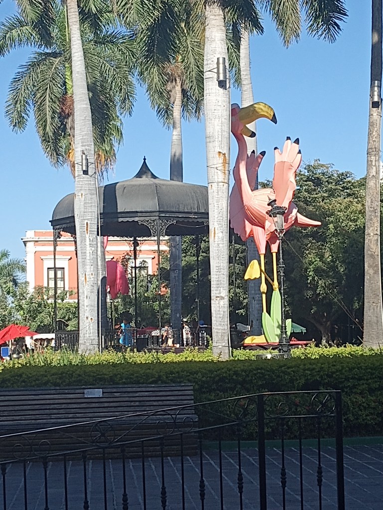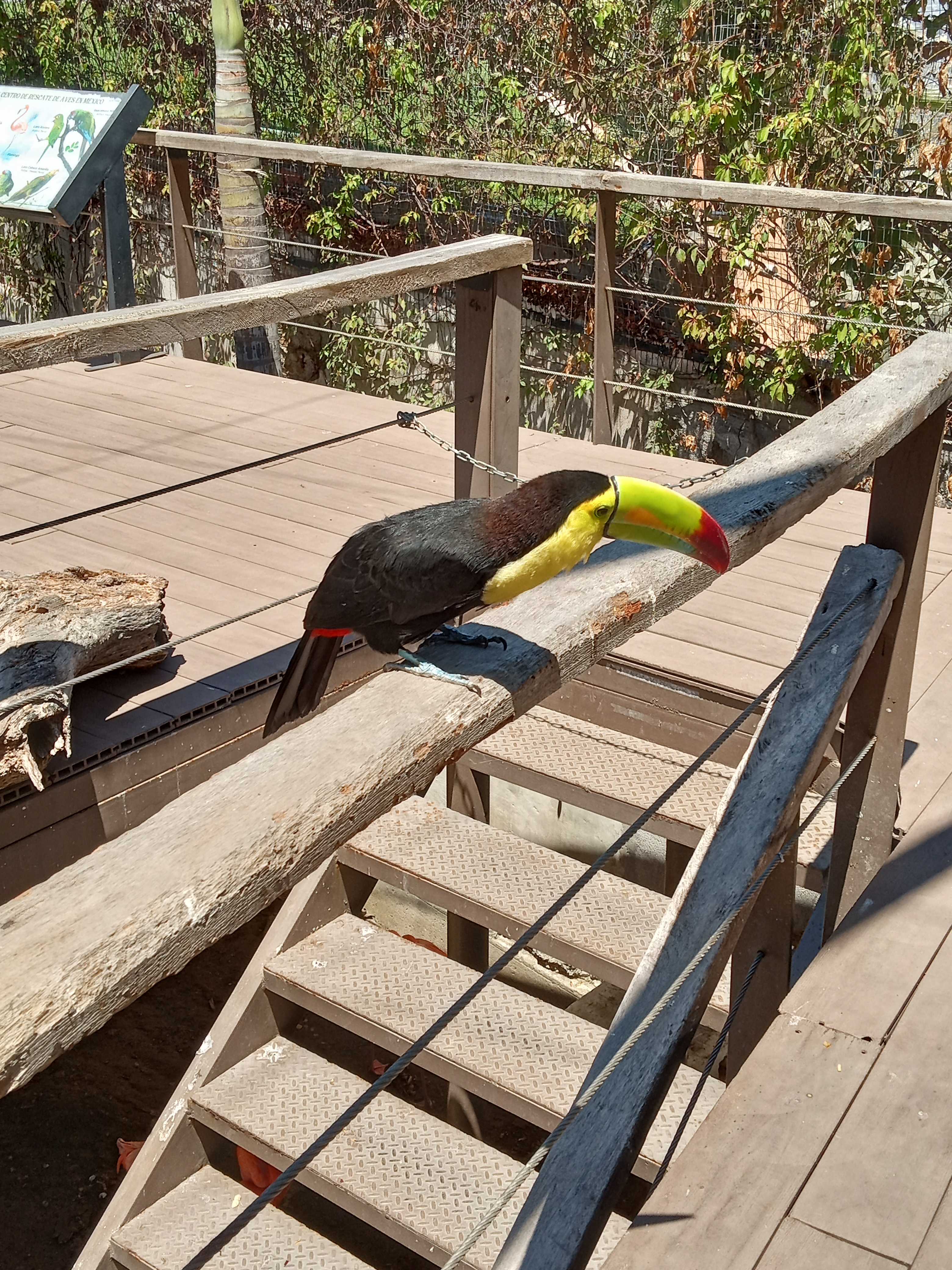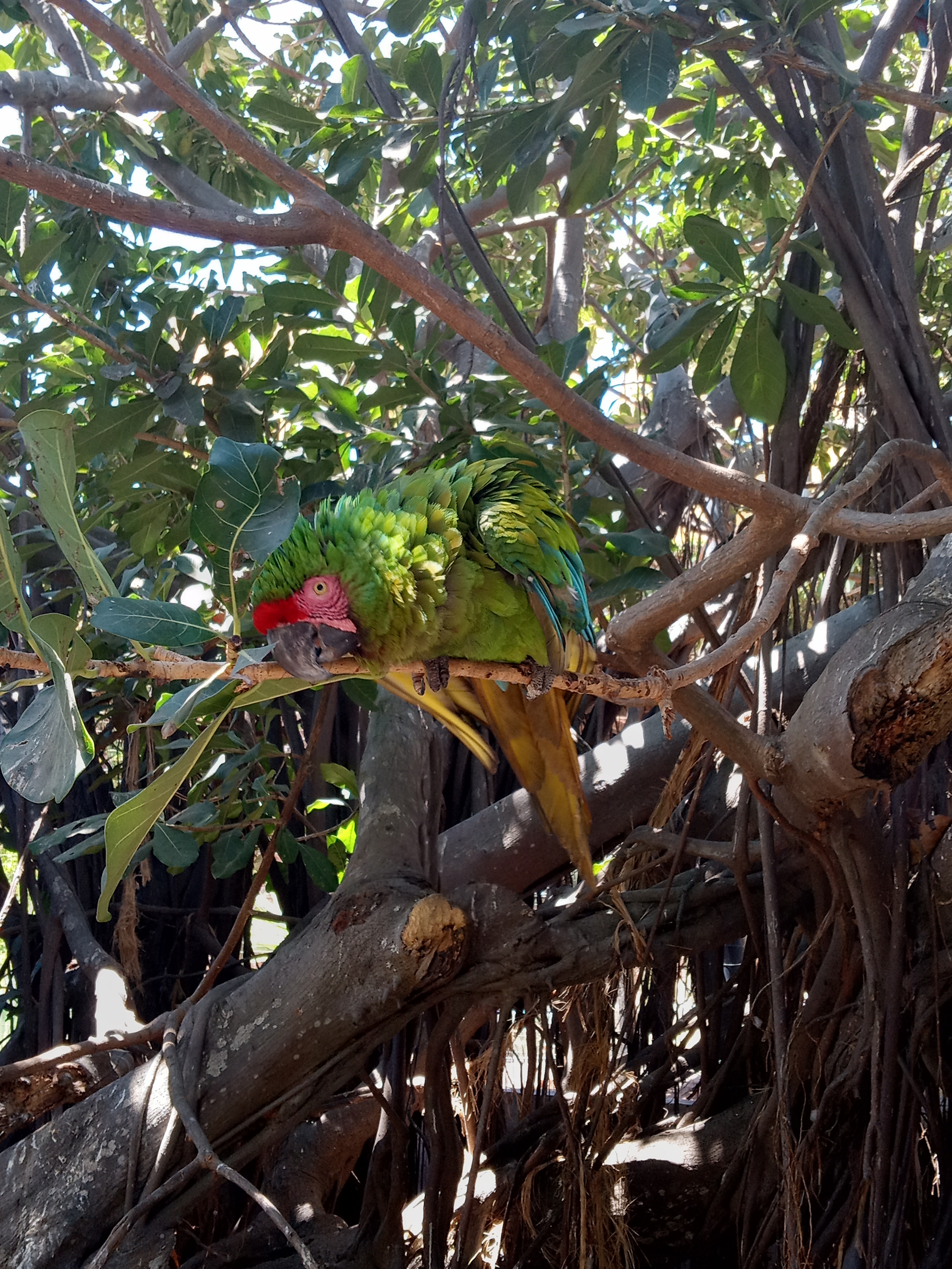 While walking back on the first day we had spotted the Observatorio 1873 and decided it was a tourist attraction worth checking out so we headed there the next day. The Observatorio was the site of a Fort meant to protect the city and the site has been turned into a museum/ animal rescue. There is a funicular on site and we were excited to go for a ride in it – only to find out it was out of service when we got there!! Instead, we had a long climb up a staircase that meandered through terraced gardens (they did have the option to been driven to the top but the gardens were so beautiful it was worth the trek). We first visited the Iguana refuge where we saw green Iguanas as well as Tortoises and various birds in a large cage (Parrots, Toucans, etc.). The next area we explored was the El Nido bird sanctuary, a netted enclosed space that allowed the rescue birds kept there to fly more freely (and to eat out of my hand!!!) There was a tour describing the process of making tequila but we just walked through that section without a guide and then went to explore the museum set up on the old fort building. It was a wonderful way to spend an afternoon and we were so happy that we had gone!!! They even had a little stand selling AMAZING ice cream! We walked along the Malecon again – now completely packed, as it was Good Friday and many locals travel for Easter week and weekend. We enjoyed the spectacle down there and then called an Uber to take us to the grocery stores on the other end of town – after a terrifying ride there (the driver was not paying attention, driving like a maniac, and only avoided rear-ending a car by swerving in between it and a parked car!) we got our shopping done and had a, thankfully, more tame driver to take us back.