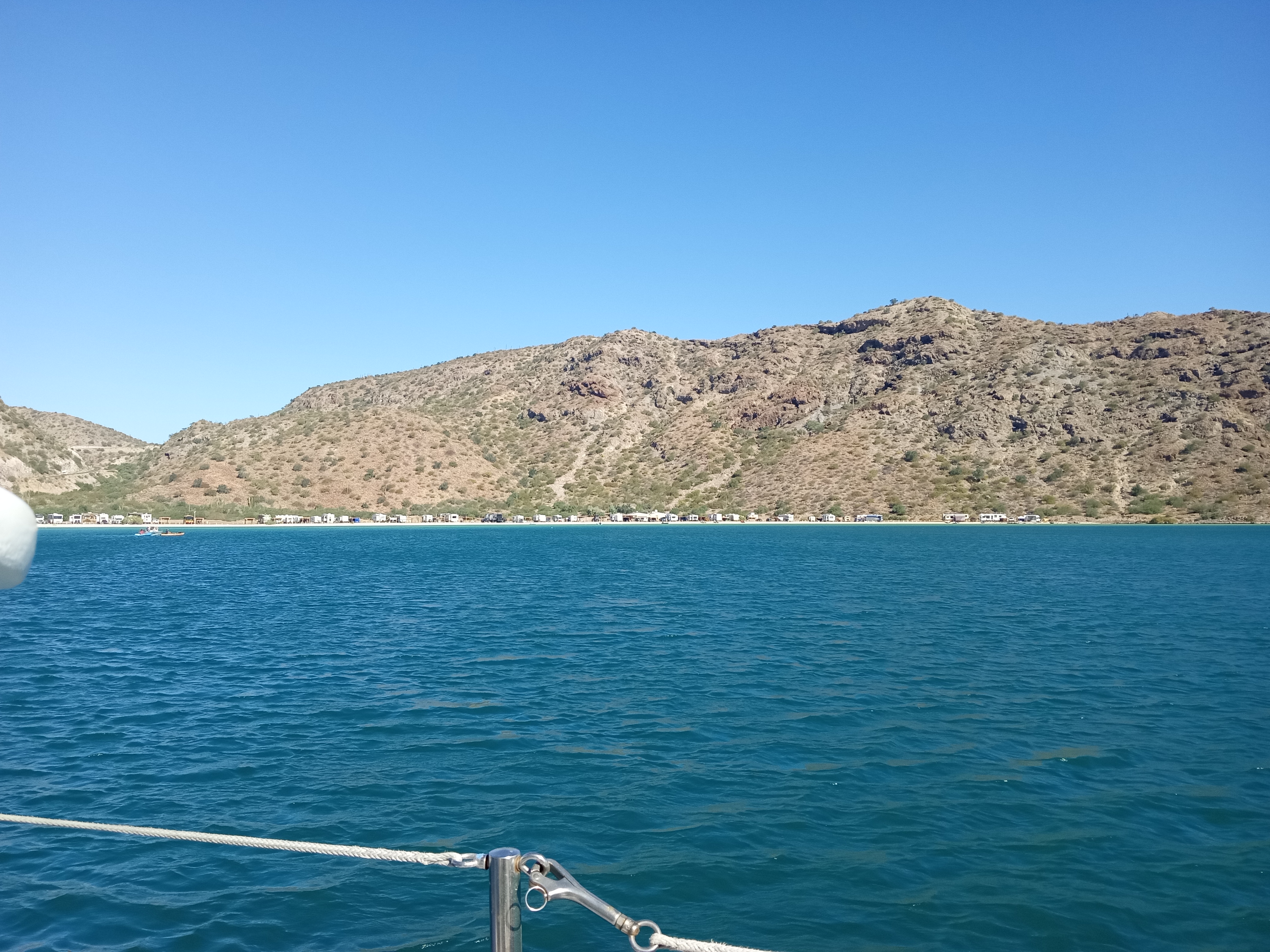 The next morning, we had the anchor up about 10am, hoping for some wind to push us down Bahia Conception to Playa Santispac. Just as we were getting ready to lift our anchor, a panga came in right behind us and we watched as they laid a net out from directly behind us to a mile out of the bay. I was sure glad we were already on our way out as, when the wind shifted around and we pulled back on our anchor, we would have landed right on top of that net!!! We were largely denied the wind, only finally able to sail the last couple of miles into the anchorage. We had come into this anchorage on our way up the sea and found quite a few boats, but almost no campers on the beach. This time there was probably twice the number of boats, and the campers were cheek to jowl on the beach – it is a beautiful spot but the close quarters seem to belie the reason for going camping on the Baja!! This was our first time being amongst more than a few boats and it was so strange!!! We just hung out on the boat the next day – occasionally considering putting the dinghy in the water but, as it was pretty blustery, deciding that we would pass.
