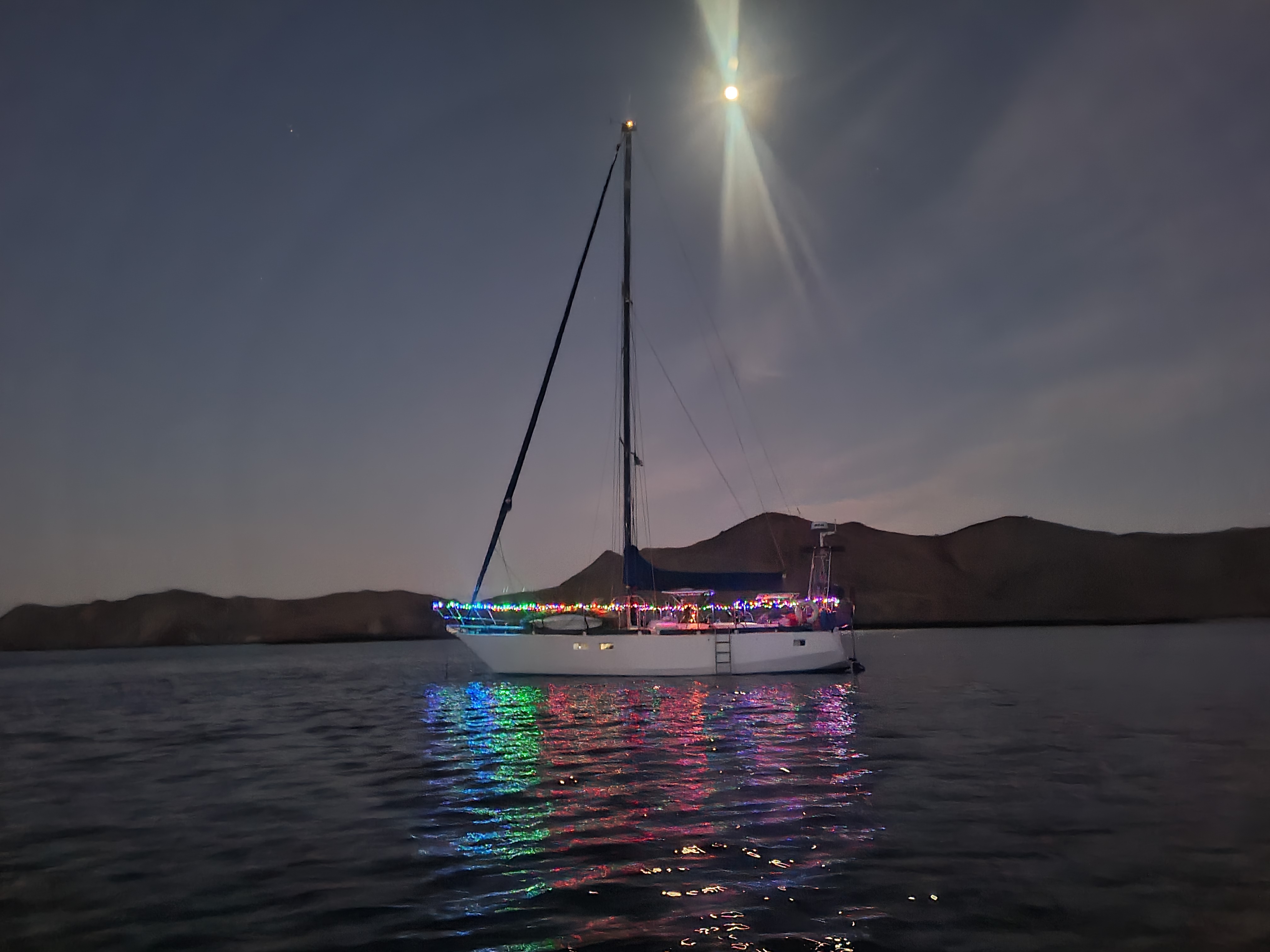 Don Juan is a good-sized cove in Bahia de Los Angeles and is protected from nearly all directions. We set the hook later afternoon, with 3 other boats in the cove and decided we were there to stay through Christmas. That being decided, I restrung the Christmas lights around the lifelines and pulled out our little tree. We enjoyed three peaceful days, watching movies, calling family and friends for Christmas and generally NOT doing anything boat chore related. We watched It’s a Wonderful Life, had blueberry muffins for breakfast and sipped Ronpope (the liqueur version of eggnog). We were blissfully lazy – that is until the head would not flush – ugggh. A blockage in the hose from the pump to the tank meant for a disgusting and stinky job – the hose had to be pulled, cleared and rinsed out and then reinstalled. Bleck!!! The joys of boat ownership I guess.
