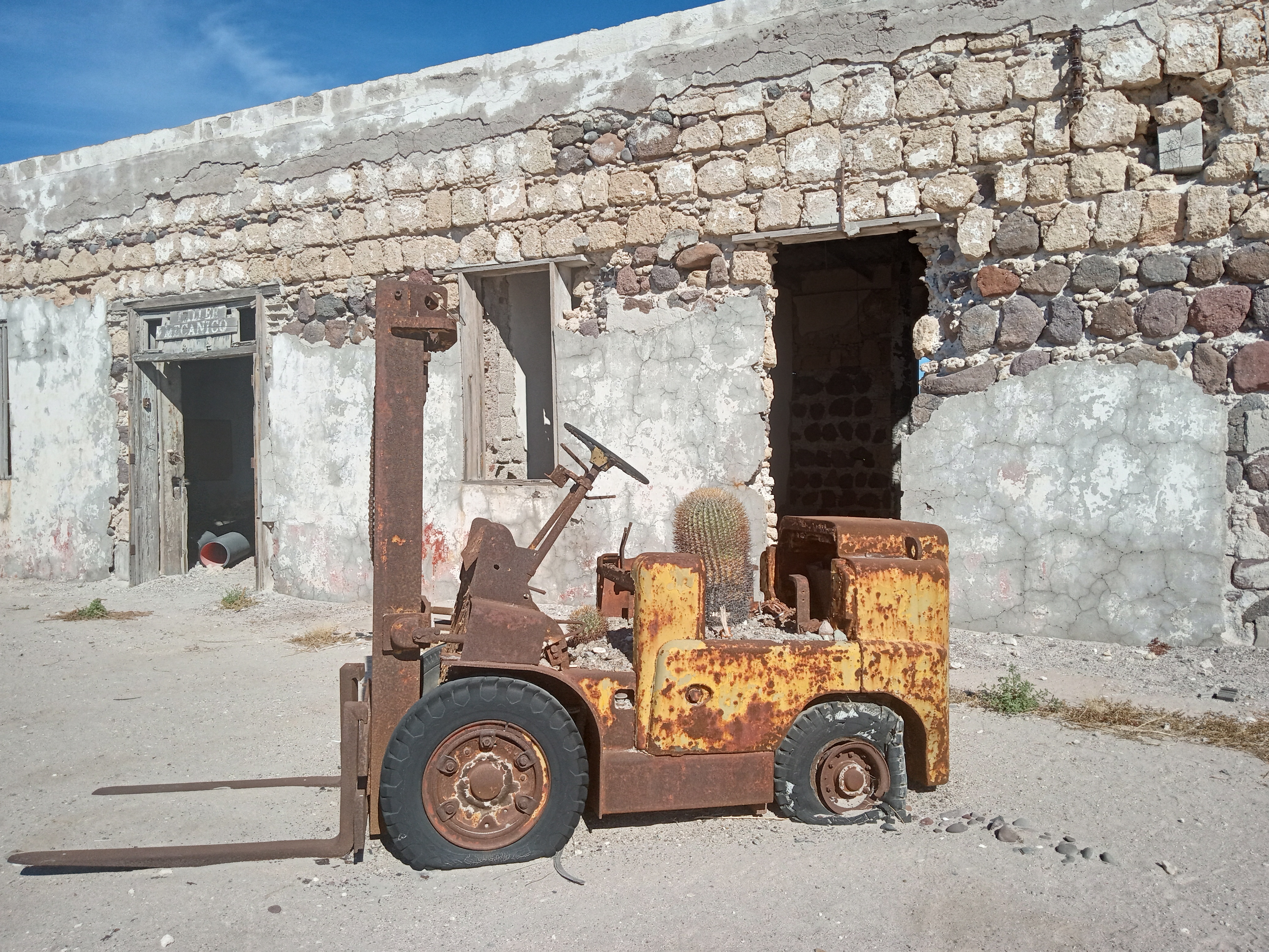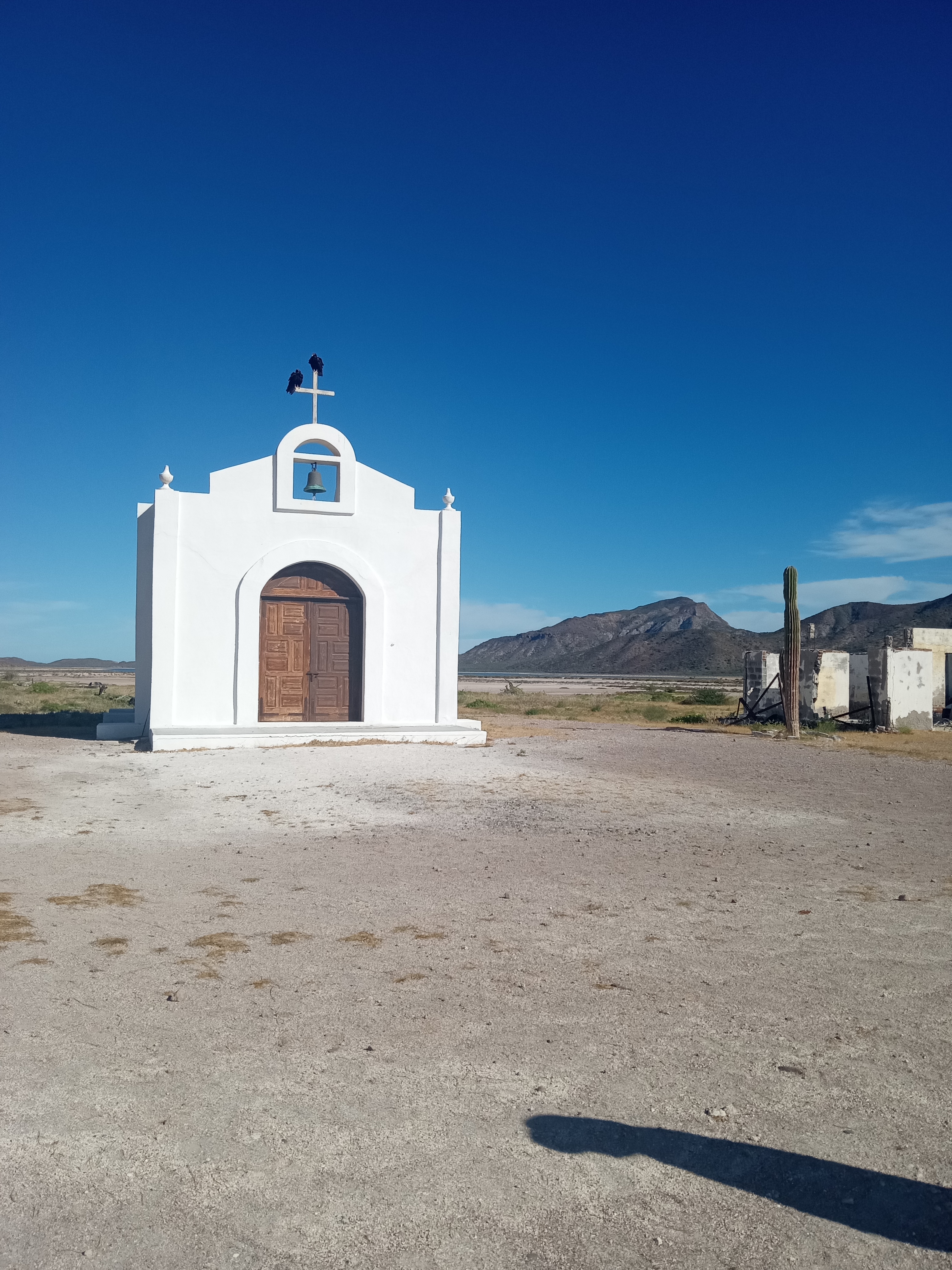 Isla Carmen offers a multitude of wonderful anchorages – we actually had not realized how many – and so, we next headed around the north end of Carmen, and down to Bahia Salinas. Salinas is a huge bay, and the site of a former salt mine. The salt ponds are all still there – though they seemed to perhaps be flooded out during the winter storms – we had seen pictures of pink water at the ponds but sadly did not see that ourselves. We did explore some of the old buildings and equipment and the immaculately maintained church. A couple of the buildings have been restored and there is now a high-end hunting lodge on the site. There has been a program to reintroduce big horn sheep to the island and, though I can’t entirely understand how a preservation project leads to a hunting lodge, that seems to have been the genesis of the lodge!! On the dinghy trip back to the boat, we tried to find the shipwreck in the middle of the bay – we were motoring around in circles when we suddenly realized that it was right under us!!!! It is a fairly large ship and apparently makes a great dive and snorkel site. We did see lots of fish there – were the water much warmer, and time more on our side, we may have stayed another day to be able to snorkel there.