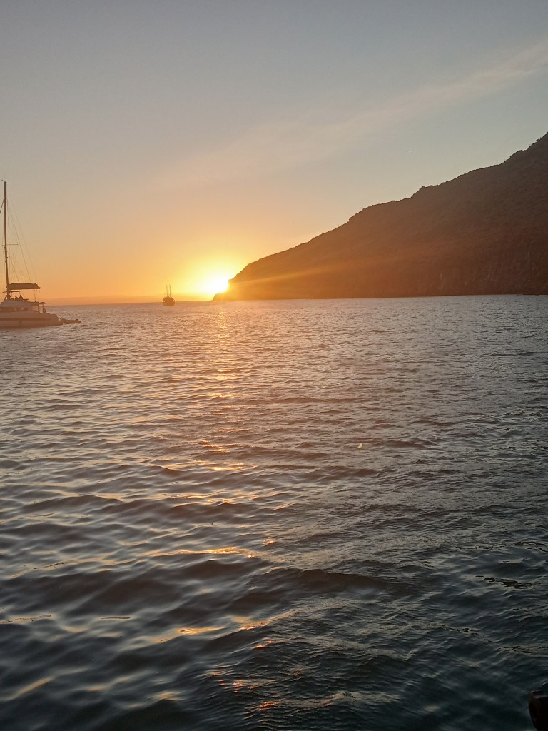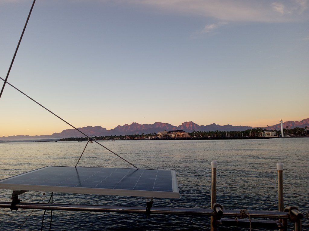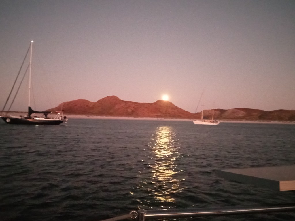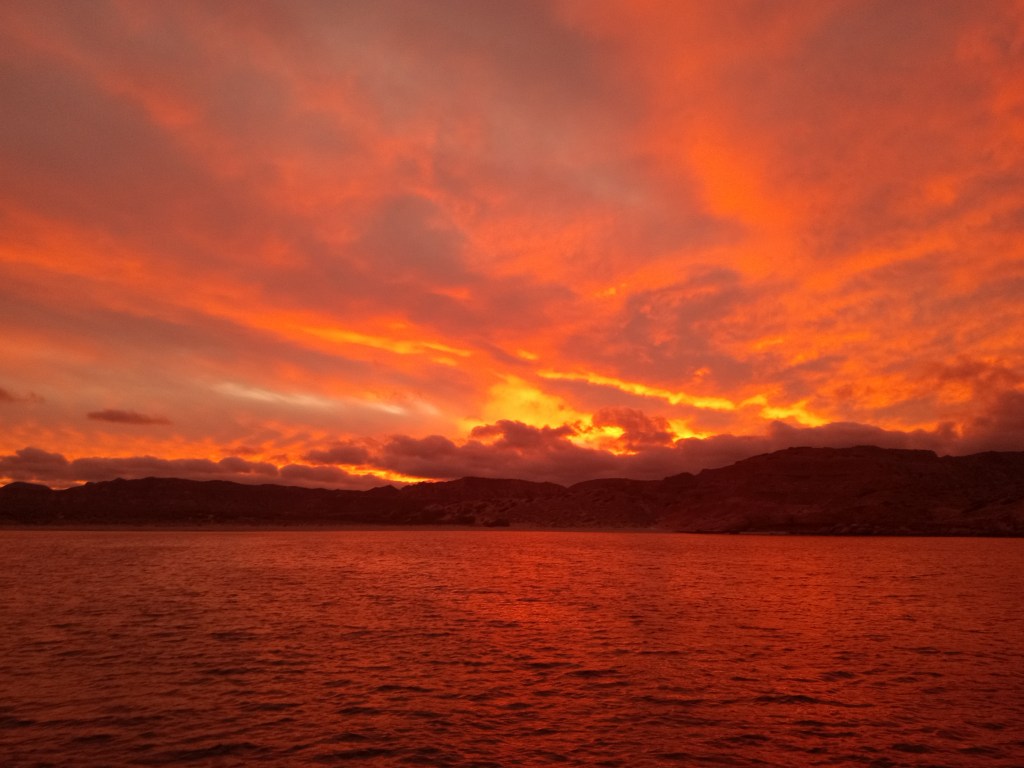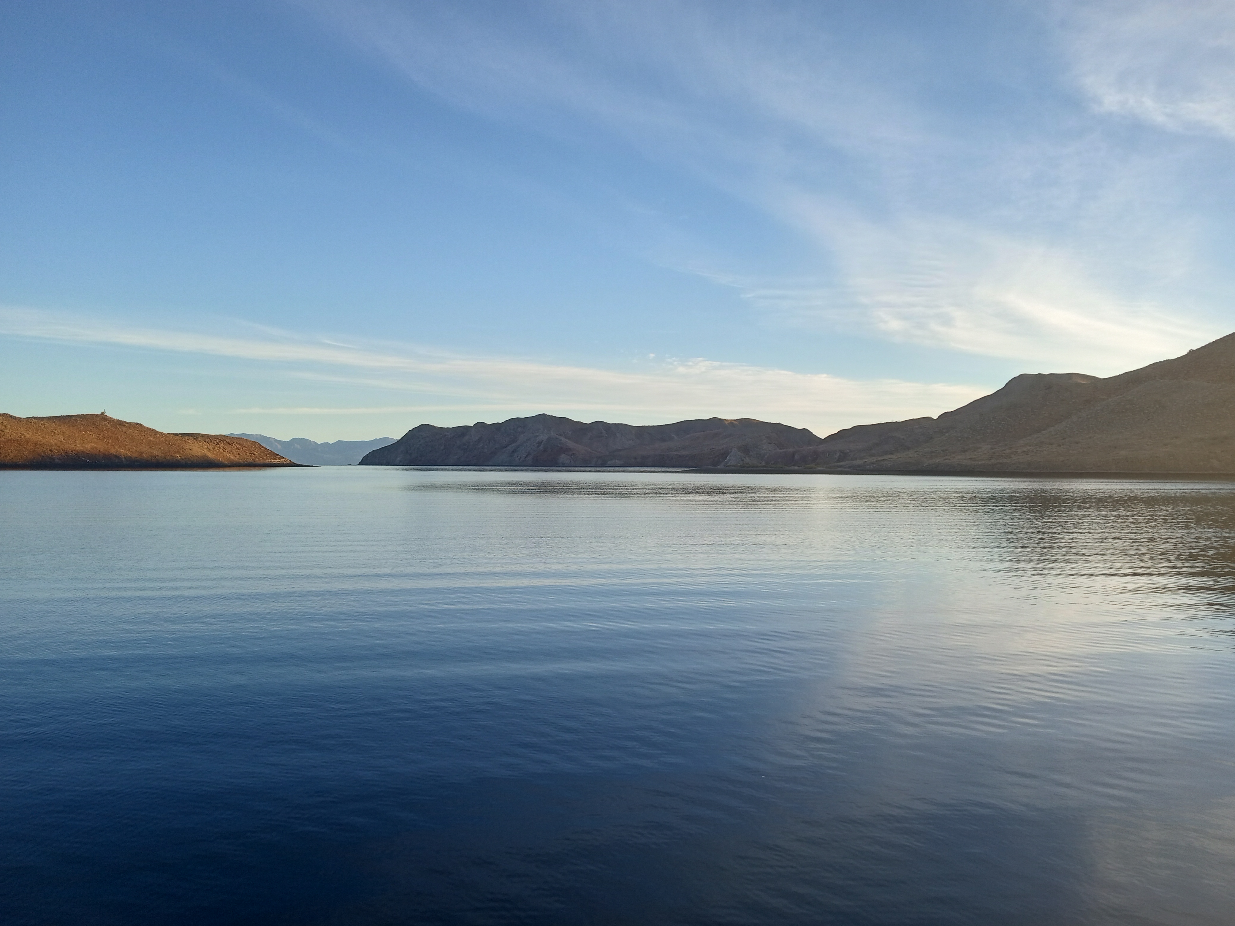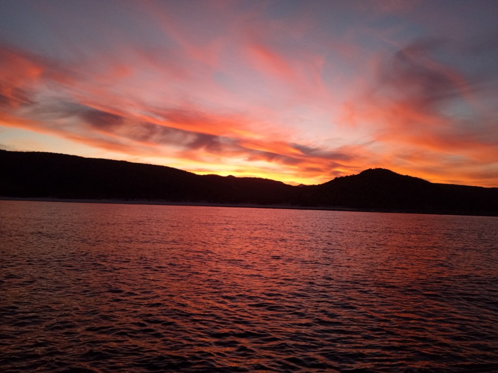 The next morning, we were at the fuel dock before they opened and had the boat filled with diesel and water by 9:30. We had a fairly long run to do so wanted to get underway early! We sadly ended up motoring most of the way to Agua Verde under grey, somewhat threatening skies and nearly no wind. We arrived at Agua Verde mid-afternoon and anchored in Pyramid Bight with several other boats. Though we loved Agua Verde on our first trip, the dark skies meant we didn’t get to enjoy that green water. We did have the most breathtaking sunset there – I had poked my head up just to take a look-around and literally said wow! at the amazing red sky. We would have loved to have stayed here longer but it was starting to feel like more than time to get across to the mainland and we still have a long way to go!
