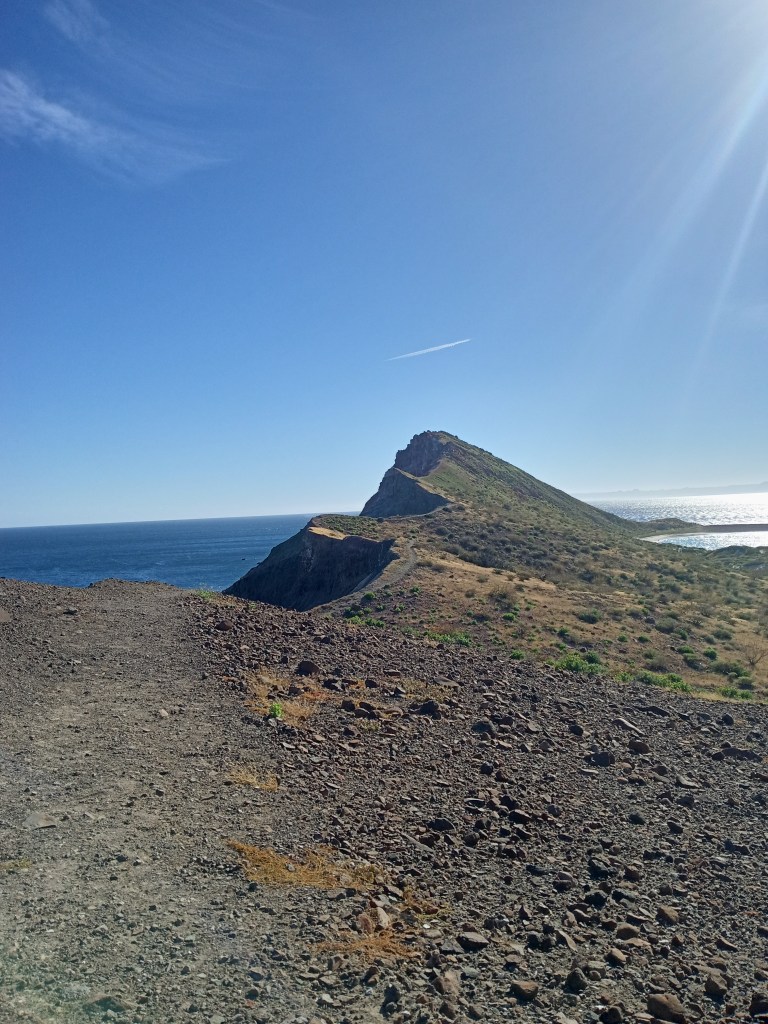 It was fairly rolly when we woke up the next morning – the wind was more north-west than north so we were getting a bit of wrap around swell (the anchorage is very open to the west). Once a few boats had headed out, we took advantage and moved in closer to the beach, getting us out of the worst of the swell. We weren’t sure if we wanted to launch the dinghy in the crazy gusty conditions (nothing like have the wind grab it while it is suspended in mid-air on a halyard to be lifted over the rail!). However, as I was working on cleaning some of the stainless stanchions, I dropped a plastic scrubby into the water and couldn’t leave it there!!! We quickly got the dinghy in the water (yes a gust came just in time to whip it out of Owen’s hands!) and retrieved the scrubby. As we had the dinghy in the water anyway, we headed to the beach later that afternoon where we met cruisers on another boat that had come down around the same time as us. We joined them in a beach walk, exchanging war stories from our first year in Mexico! We spent the next day on board, with strong gusty winds blowing all day – thankfully the conditions in the bay remained relatively calm – just a very slight bit of hobby horsing occasionally. By day 3 we were again itching to get to shore and, realizing that we would soon have a long stretch of not being able to stretch our legs, we decided to do the ridge hike. The climb up to the hike looked steeper than it was and we managed to scramble our way up fairly easily – the tough part came when we went to head south along the ridge – it is a long drop down on the east side and the path was getting fairly narrow – add to that my insane fear of heights and winds gusting high enough it felt like we could get blown off, and we ended up opting to head back around more to the north and then down through the salt flats. The ridge is an ideal place to get a glimpse of the horseshoe shaped bay with its gorgeous green water.