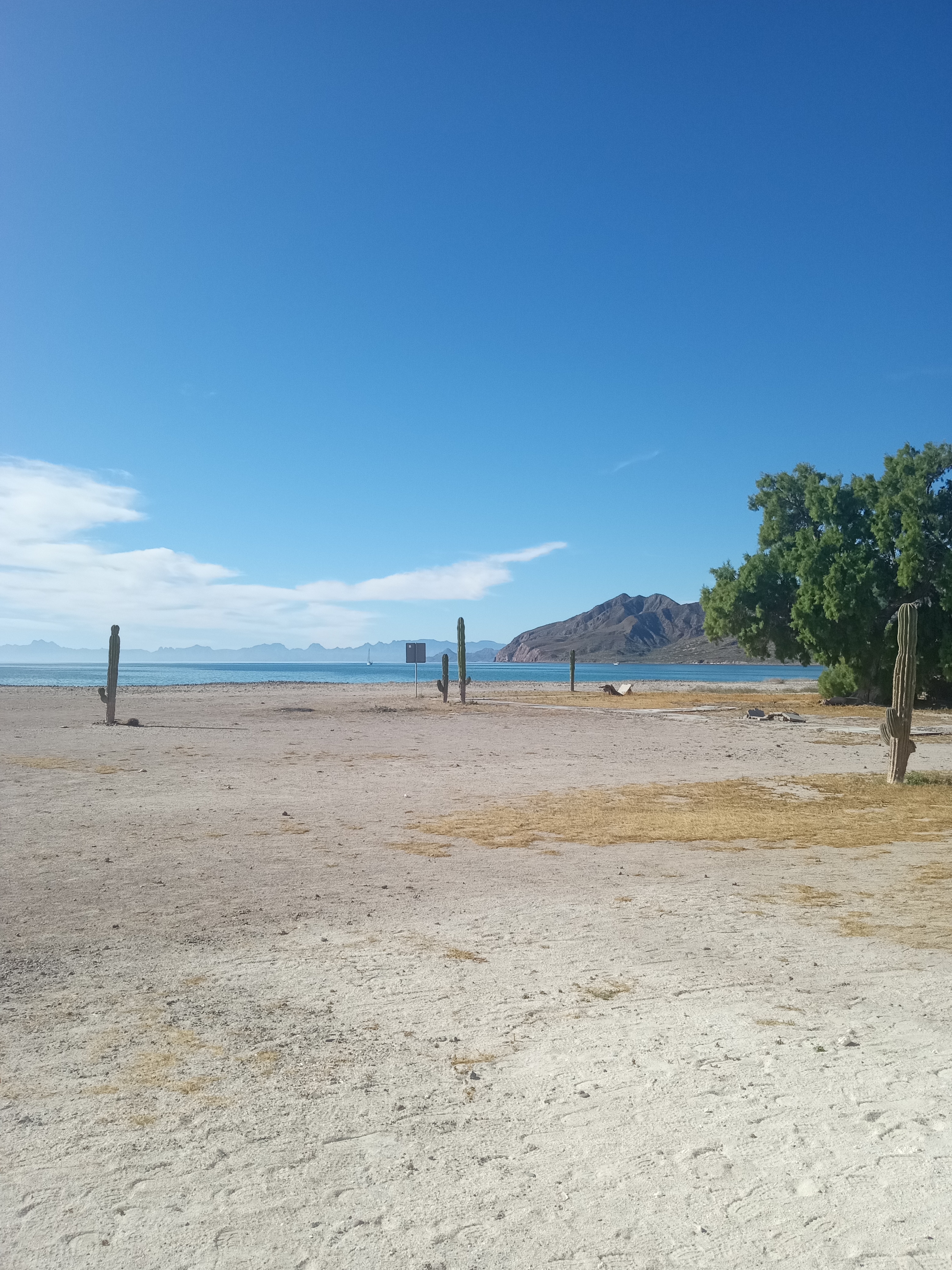 As much as we would have loved to have stayed at San Juanico for a couple of days, the weather forecast said we had better move on so, the next day, we lifted the anchor around 9:30 and with the headsail only out, we motored and motor sailed in very light conditions. We finally started to see more sealife on this trip – to now we had seen only a few dolphins – this trip we saw whales in the distance, dolphins and rays!!! We arrived at Isla Coronado mid-afternoon. Of course, the winds arrived just as we did, leaving the anchorage a bit windy for the first couple of hours that we were in. The next morning, I awoke to realize that all but one of the 5 or 6 boats that had been in the anchorage the night previous were gone – did they know something we didn’t? We opted to move the boat in closer to shore to get more into the lee of the island and put the dinghy in the water. We took the dinghy for a motor around towards the north end of the Island, hoping to perhaps see the Blue Footed Boobies that we knew nested there. On our first trip to Loreto, so many years prior, we had taken a snorkel trip over to Isla Coronado. The trip included heading around to the north end of the island – we were told to see Sea Lions – unfortunately the conditions were a bit spicy and some of our fellow passengers were not entirely comfortable (actually entirely terrified) – as we had of course seen plenty of sea lions, we advised the guide that if the rest of the group were not comfortable going around the island, we were okay to go back and start snorkeling. It was only after we got back and talked to the people on the other boat in our group that we learned there were blue footed boobies and they had in fact been spotted. Keeping this in mind, we really wanted to head around to the north end – unfortunately, the increasing north winds stopped us shy of our goal – we made it roughly to the top corner and then decided it would be safer to turn around and head into the beach. We went for a short walk in lovely white sand and then headed back to the boat. By the time we returned to the boat, we were the only boat left in the anchorage and so enjoyed a peaceful night at anchor.