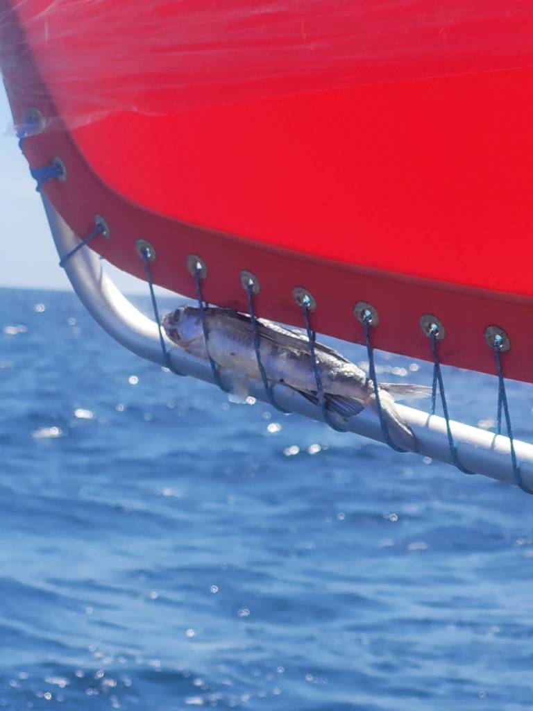 Just the next night, as I was happily playing solitaire on my phone instead of hand-steering through my first night shift I suddenly got whacked in the face – hard and out of nowhere!! I had no idea what had happened until I felt and heard the fish flopping around in my lap. I screamed – loudly – and flew to the opposite corner of the cockpit. When Owen rushed on deck – probably figuring our mast was coming down or the hydrovane was coming off again, he found me crouched in the corner, clutching my face and saying repeatedly “flying fish in the face, flying fish in the face”! Sure enough, when Owen got out a flashlight and panned it around, there was a flying fish still flopping around where I had been sitting moments ago. Owen dispatched it back to the sea and, after a good laugh at my expense, went back to sleep. I went below the scrape the skin right off of my face!!!