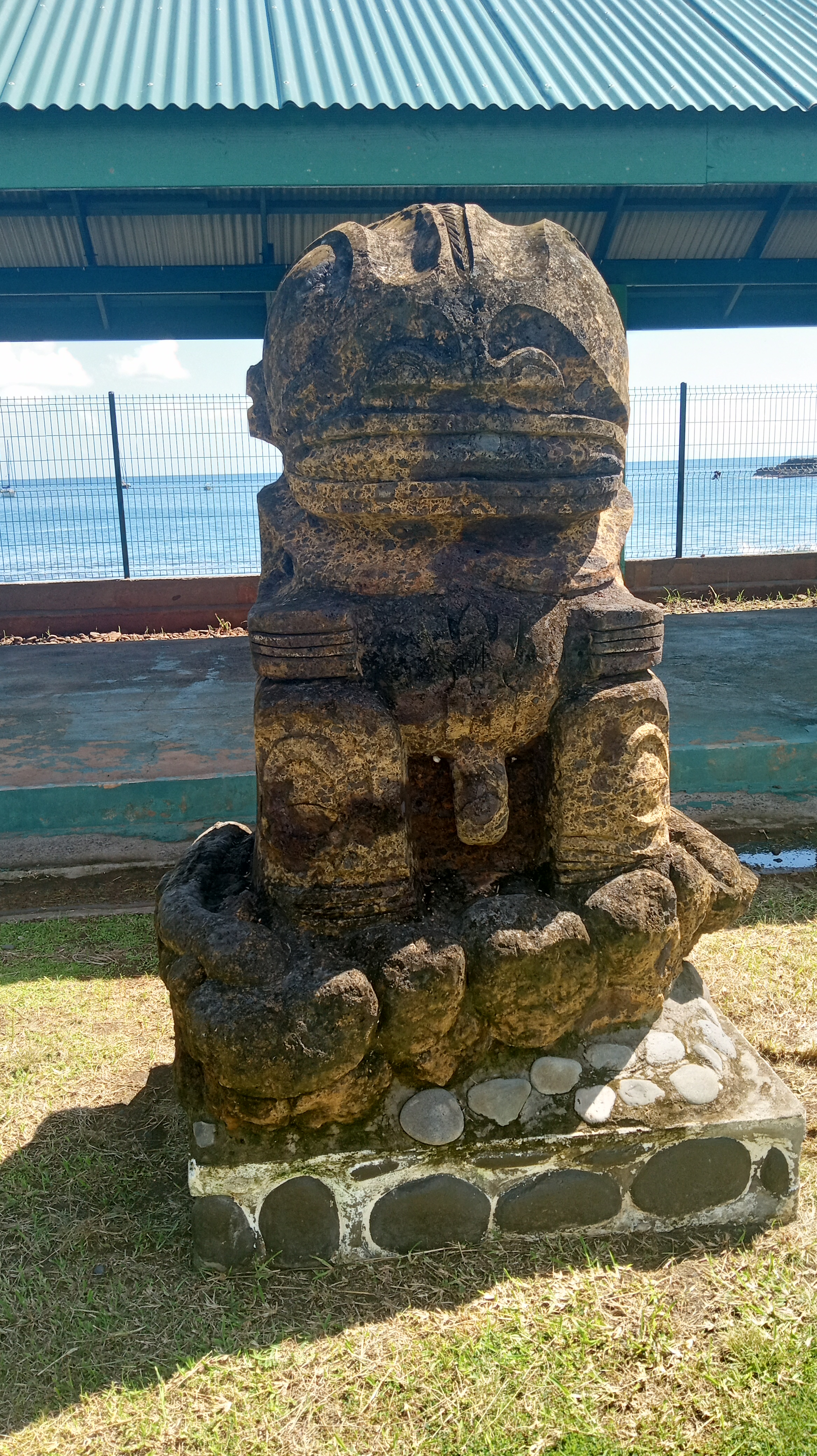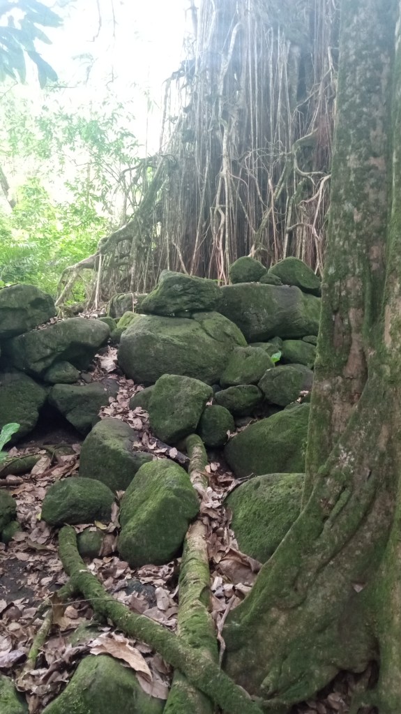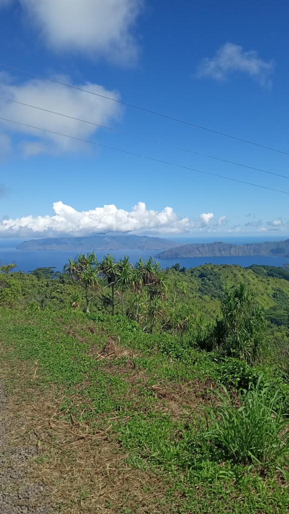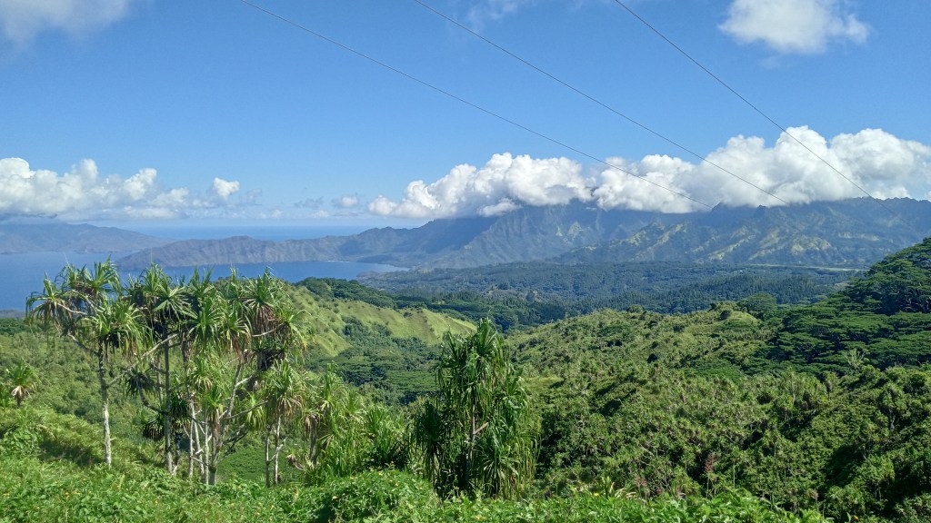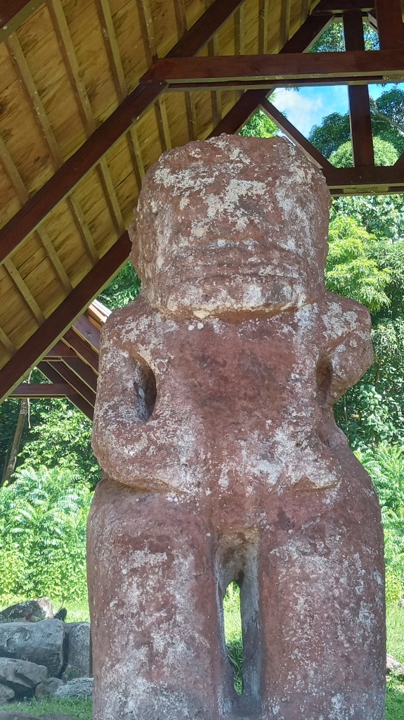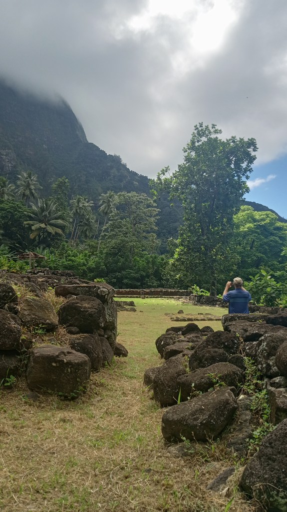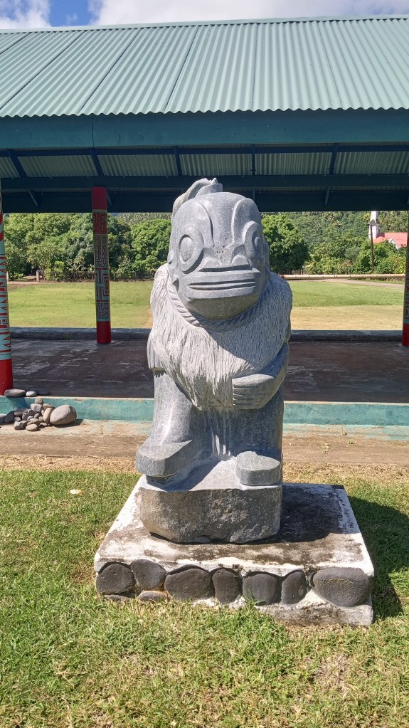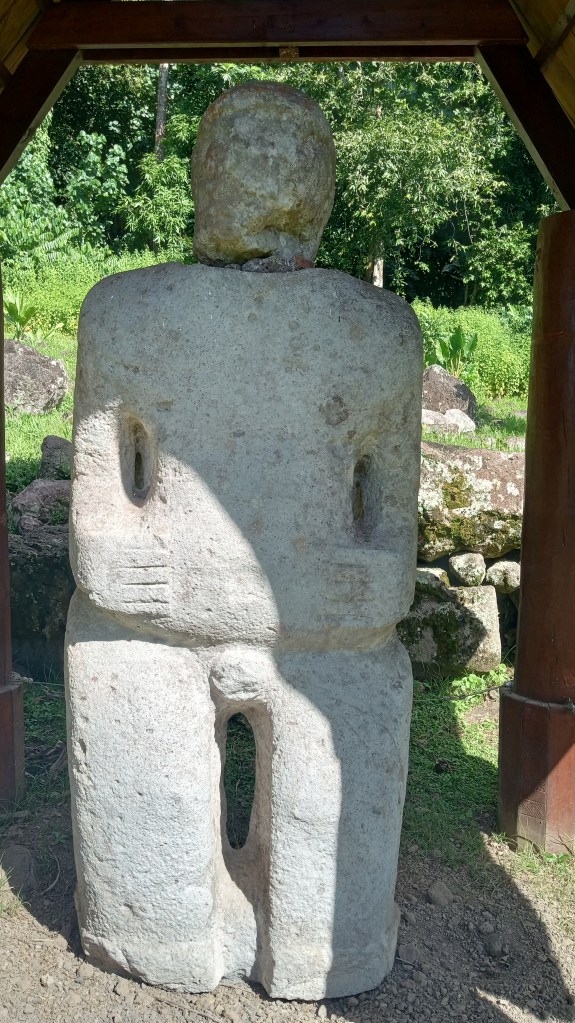 Our second trip to Atuona we were able to sneak a bit further into the harbour, though it was still quite rolly it at least made for a shorter, drier trip in the dinghy. On this trip, we tried to book a tour of the island, arranging it for the day before we intended to head out again. Unfortunately, the guide was sick the day we wanted to go and we weren’t able to reschedule with him because we were heading out on a good weather window. Instead, we decided to rent a car and tour the Island ourselves. We did make it to the sites that we would have seen on a tour and were able to google for information on some of them. Owen loved the windy drive (me not so much!) and it was stunning to see the lush diversity of greenery on the island – from palm trees to banyan trees and everything in between. We managed to make it from one end of the island to the other before returning to the boat having seen an ancient village site (where human sacrifices were performed) and a number of tikis.