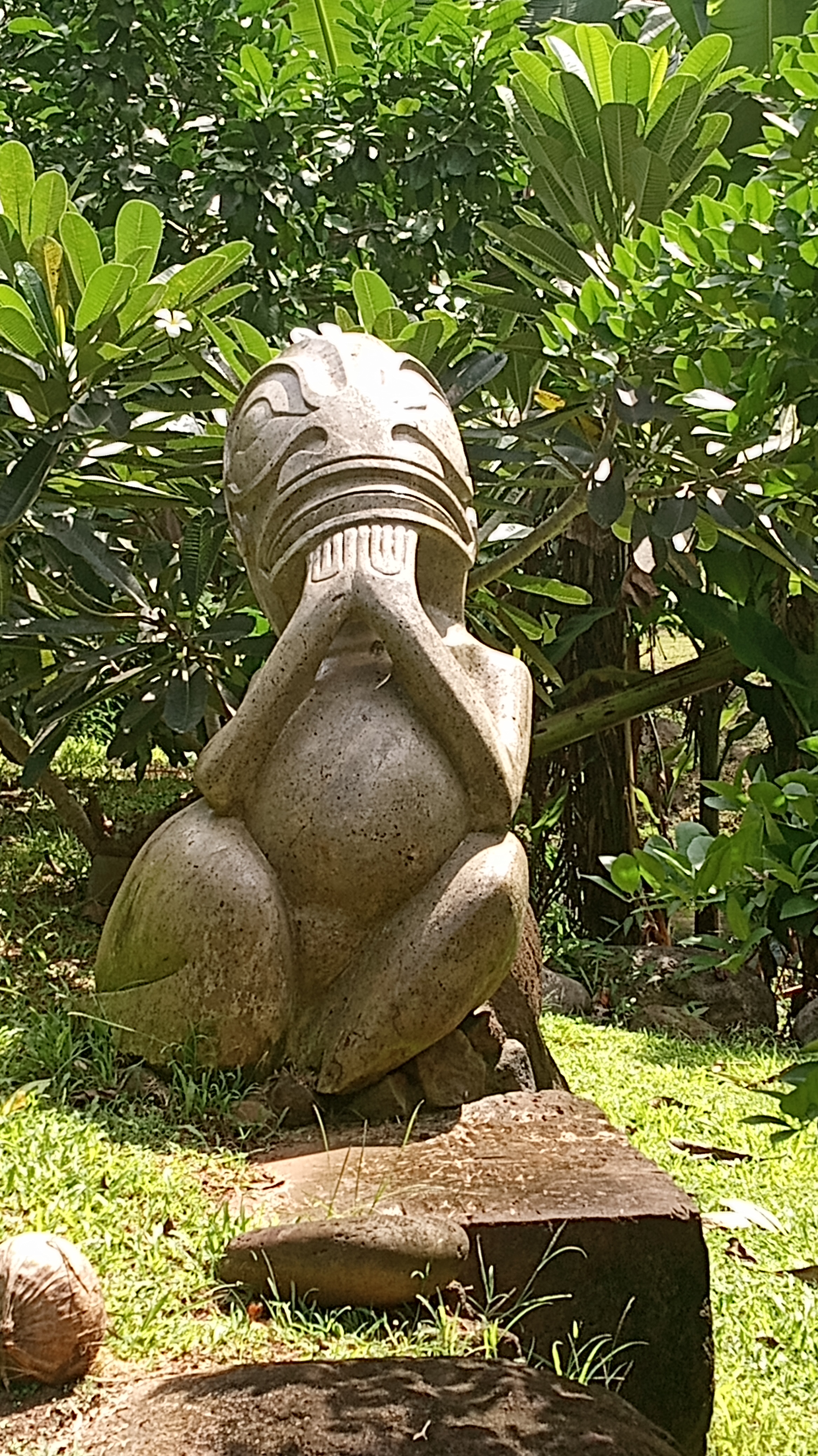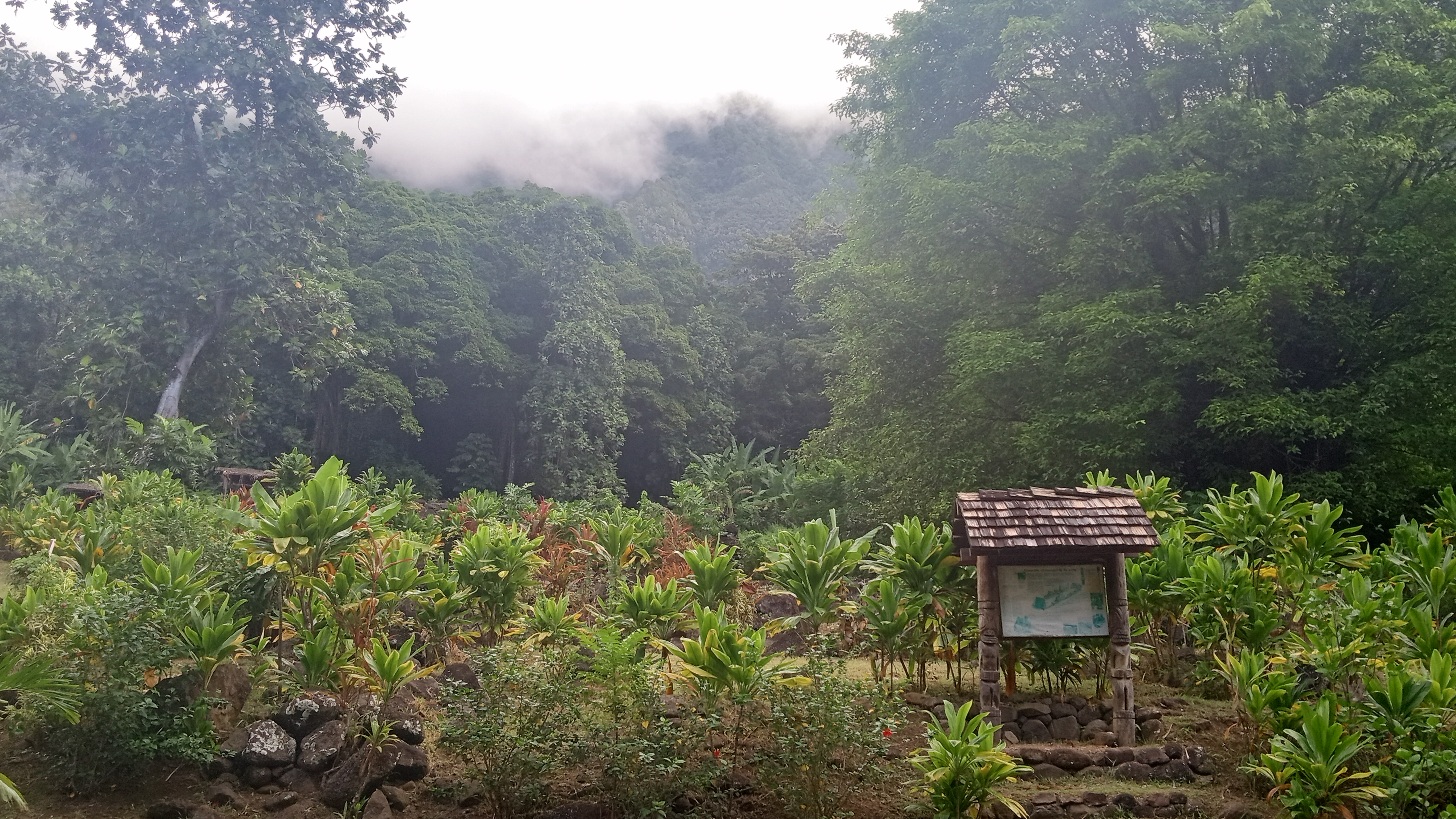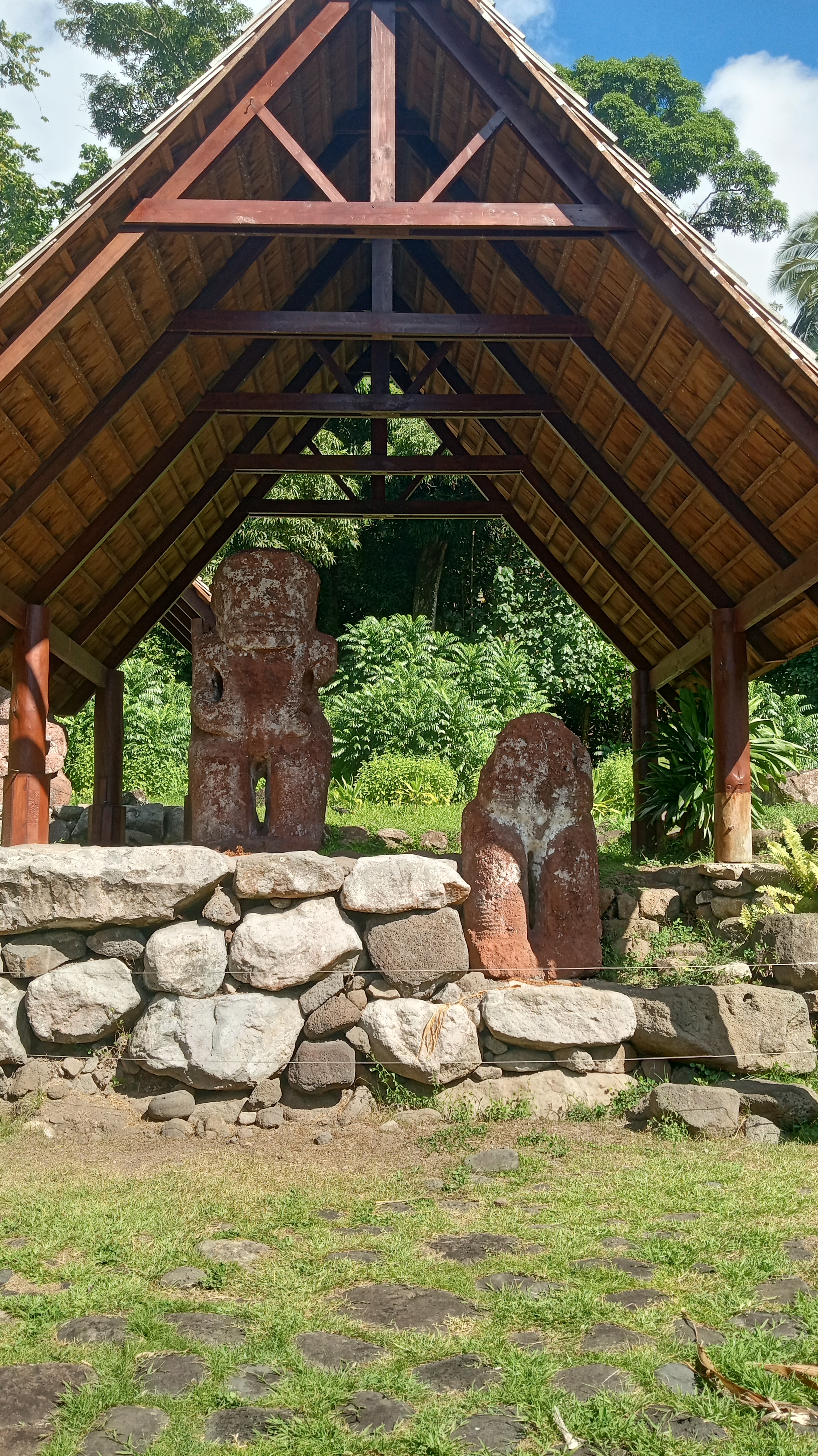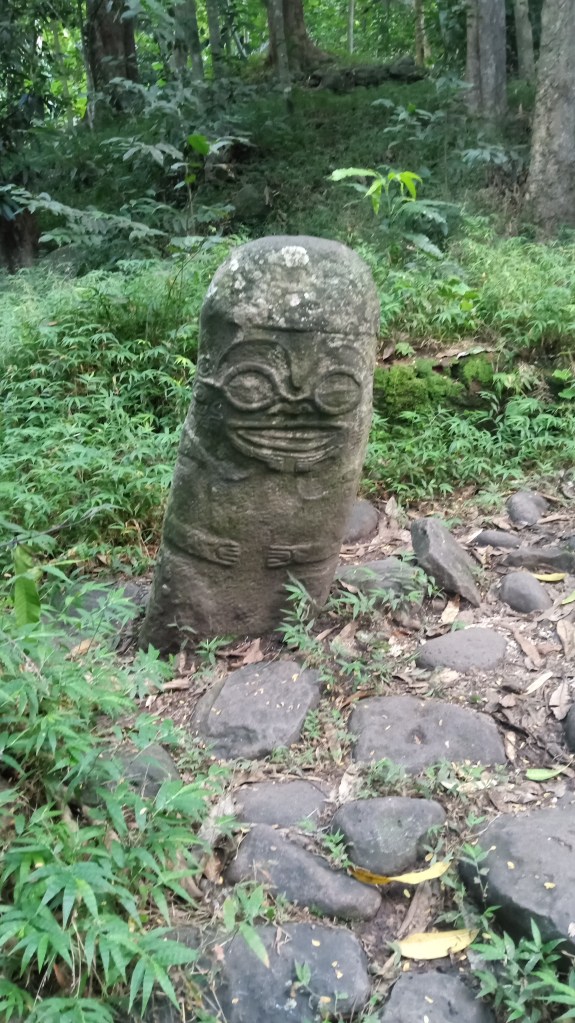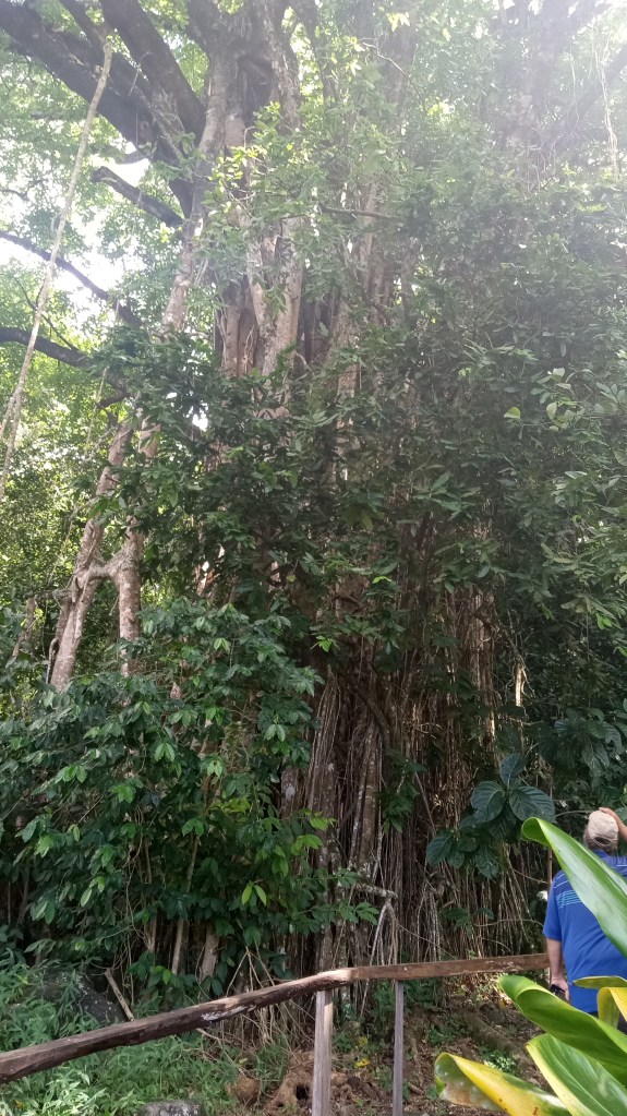 Our second trip to Atuona we were able to sneak a bit further into the harbour, though it was still quite rolly it at least made for a shorter, drier trip in the dinghy. On this trip, we tried to book a tour of the island, arranging it for the day before we intended to head out again. Unfortunately, the guide was sick the day we wanted to go and we weren’t able to reschedule with him because we were heading out on a good weather window. Instead, we decided to rent a car and tour the Island ourselves. We did make it to the sites that we would have seen on a tour and were able to google for information on some of them. Owen loved the windy drive (me not so much!) and it was stunning to see the lush diversity of greenery on the island – from palm trees to banyan trees and everything in between. We managed to make it from one end of the island to the other before returning to the boat having seen an ancient village site (where human sacrifices were performed) and a number of tikis.