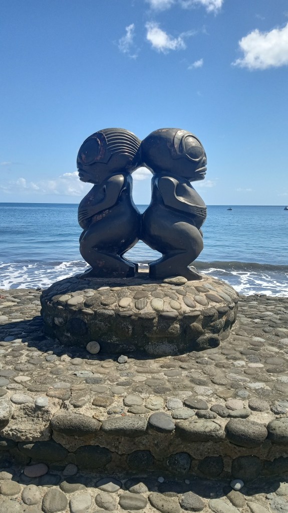 The next day we went the short distance down to Bahie D’Omoa. This is a very exposed, rolly anchorage – you could not anchor too close to shore as the surge was crashing into the shore. We got ourselves settled and took the dinghy into the thankfully protected dinghy dock. I think this was our favorite town in the Marquesas – the locals were all so friendly and seemed truly happy to welcome you to their beautiful village. To that point, we had found that the locals were polite but not overly friendly so it was a breath of fresh air to see so many beautiful, welcoming smiles. There were a number of tikis spread throughout the town and a good eagle eye view of the anchorage. We were able to stock up on a few items – even eggs – and then got the boat tucked away for the trip back north. This time we left mid-afternoon, arriving back at Tahuata early the next day.