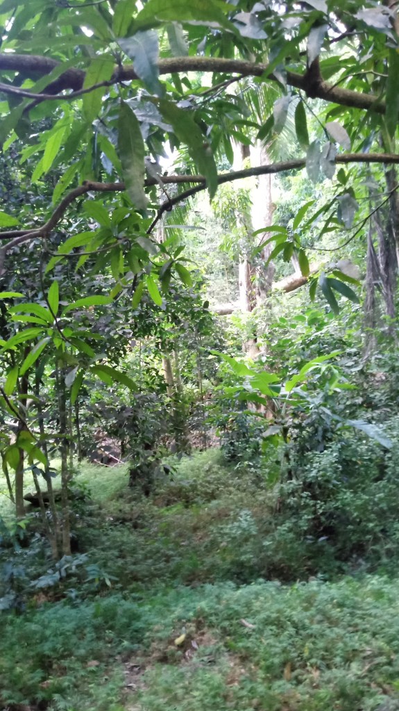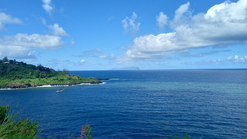 The other anchorages that we stayed at on this Island were Vaitahu Bay and Baia Hanamoena. Vaitahu bay had a small village that included a grocery store and a couple of food “shacks”. The disadvantage to this bay is that it was in the mouth of a valley, and the wind would rip through the valley, accelerating its way through the anchorage – a 15 knot wind anywhere else would be blowing 25 in the anchorage. There was also a fair swell into the anchorage and the dinghy dock was completely exposed – it took some timing to jump off onto the dock as the boat rose up into the swell – and even more to get back into the dinghy!! We actually had to use a stern anchor on this dinghy dock, just to keep the dinghy from crashing into the dock with each swell. The town was lovely though and the store fairly well stocked. We did have lunch at one of the shacks on our first visit and while it was not anything to rave, I didn’t have to cook it so that makes it fantastic!! On our second visit to the bay, we were lucky enough to find a local selling both beautiful carving necklaces (I got an adorable sea turtle necklace) and a bag full of delicious mangos. We also met up with a cruiser who introduced us to a local who had a beautiful garden and was able to sell us a huge bag of pamplemousse, starfruit and another fruit that I still haven’t entirely identified. It was the first time we had been able to buy fruit and I was so excited!! It was also a great opportunity to realize how extensive the little town actually was, rising up the hill with the properties hiding amongst the lush foliage.