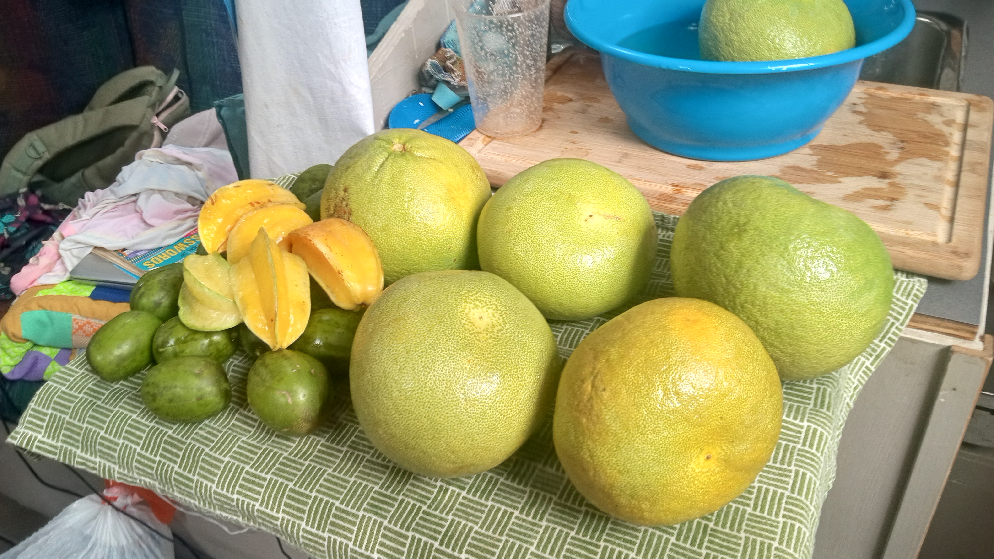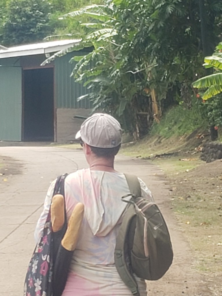 Grocery shopping is another of the challenges in the Marquesas. Fresh food is nearly non-existent. If you make it into a store on supply ship day, you may find a slightly better selection – potatoes, carrots, apples – but even then, there is not much to choose from. I actually found a clamshell package of spring mix lettuce one day and was beyond excited – it was probably over $10 for that little package of lettuce but we sure did enjoy our salads!! The meat selection is limited to frozen items – I once managed to find a bag of frozen chicken breasts but otherwise chicken, beef and pork seemed most commonly sold in packages of diced chunks of meat – it was a bit off-putting. I did splurge on a roast one day and we enjoyed a delicious traditional roast dinner, right down to the Yorkshires. Most of the stores we were at had a good selection of canned goods, flour, spices, etc. – even the gas station. You could buy baguettes nearly anywhere – but eggs were gold – I managed to get them at the gas station once by asking for them (she had them hidden in the back) and found them on the shelf at Fatu Hiva. Luckily, on our last grocery run at Atuona, the ship had just been in and there was actually a box full of egg cartons. It is so funny that in a place where there are chickens running everywhere, it is nearly impossible to get eggs! Cream cheese, cheddar cheese and sour cream do not seem to exist here – you can usually find brie and emental but it is quite pricy. I can occasionally find a package of yogourt – at a premium and only if the supply ship has just been in. I found a loaf of actual fresh sandwich bread once – I don’t know what I paid for it and probably don’t want to!! I do know that you could buy a loaf of frozen bread for about $12 if you were lucky enough to find it in a freezer. I have resorted to baking bread and buns about every second day just to ensure that we can have sandwiches and toast – that has been an interesting challenge as I am just not a natural baker – I am starting to get pretty good at it though!