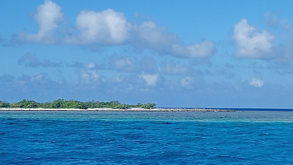 We finally headed over to the south pass the next day – the anchorage is a bit of a nightmare with giant coral bommies everywhere!! We milled around trying to find a clear patch of sand to drop the anchor, that was not too close to other boats. We finally settled on a spot and Owen deployed the anchor, floating our chain with fenders every 50 feet or so, as we had been doing in other anchorages in the atoll. We let the boat back down and realized all to quickly that we were closer to the boat behind us than we wanted to be. We decided to reset and started to bring up the anchor, only to discover that we had somehow already wrapped ourselves around a bommie!! We tried to drive around to clear it but I think we guessed the wrong direction and wrapped it even worse!! Owen finally had to get into the water with a mask and snorkel to see where the chain was wrapped – as we would unwrap from one bommie, the slack chain was wrapping on another – we tried for nearly an hour to unwrap us with Owen in the water and finally ended up with him at the helm and me on the bow shouting directions for where to turn while keeping up enough speed that wouldn’t let the chain go too slack – nearly two hours later we were off – finally!! We moved a bit further east and set in a good patch of sand – but when we backed down we were too close to the reef and so we again pulled up anchor and tried again – finally, nearly 3 hours after starting the process, we were anchored (though it felt like we were so far east we may as well have stayed at Harifa!!).