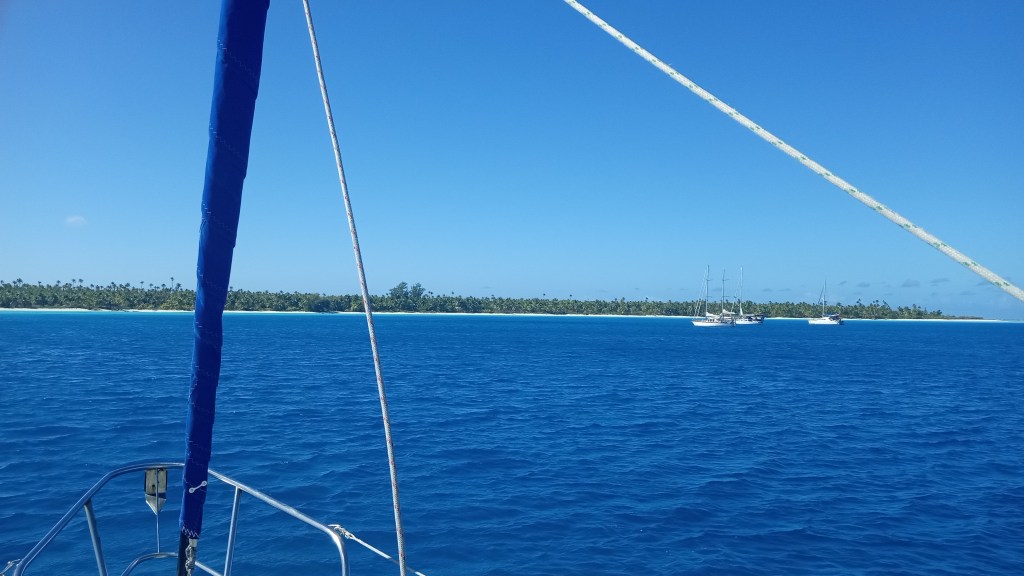 In looking at the charts, we realized that we were almost due north of the last of the French Polynesian Islands, Maupihaa – a very small atoll in the middle of the Pacific. We altered course for the 70 mile trip down to Maupihaa. We were a bit nervous with this plan – if we didn’t make it to Maupihaa before the wind filled it would be nearly impossible to get in through the very narrow, shallow pass. In that case, we would be hundreds of miles from the nearest safe harbour and would likely just have to batten down and suffer through the system. As it was, we arrived mid-afternoon and in good weather – we lined up the pass on the chart and started to approach – it was so hard to see where we were to go in – it seemed that waves were crashing directly across the pass. We were slowly approaching where the pass should be when I noticed something in the water – at first, I thought it was a small fishing boat – then suddenly, it became apparent that it was a whale – just drifting around near the entrance. We had seen a humpy breaching just a few minutes earlier but this one, and as it turned out, a smaller one, were just swimming around, enjoying the choppy conditions. They both dove and we thought they were going to head right across the front of the pass – so we did a quick turn around and then slowed right down – waiting for them to surface to confirm that we weren’t going to run into them as we made our way to the pass. We waited a few minutes with no sign of them and finally had to just hope they weren’t lingering in our path. We were looking at each other saying that we didn’t even want to try entering this pass – but the alternative, riding out the storm outside, was even worse. We finally noted that we had to enter on a bit of an angle and, taking a deep breath, we picked up our skirts and headed in through the pass. The pass felt insanely narrow (I actually wondered how catamarans were actually making it in!) and so shallow! We finally made it through the pass, making a sharp turn just as we entered to avoid a bommie and them slowly followed the path through the bommies, that was thankfully well charted on Navionics, to make our way to the North anchorage. We knew we would likely want to be in the South anchorage to reduce fetch but there were several other boats in the north and daylight was slowly ebbing so we dropped the hook for the night. We had a brief visit from one of the other boats, confirming that everyone was going to be moving the next morning.