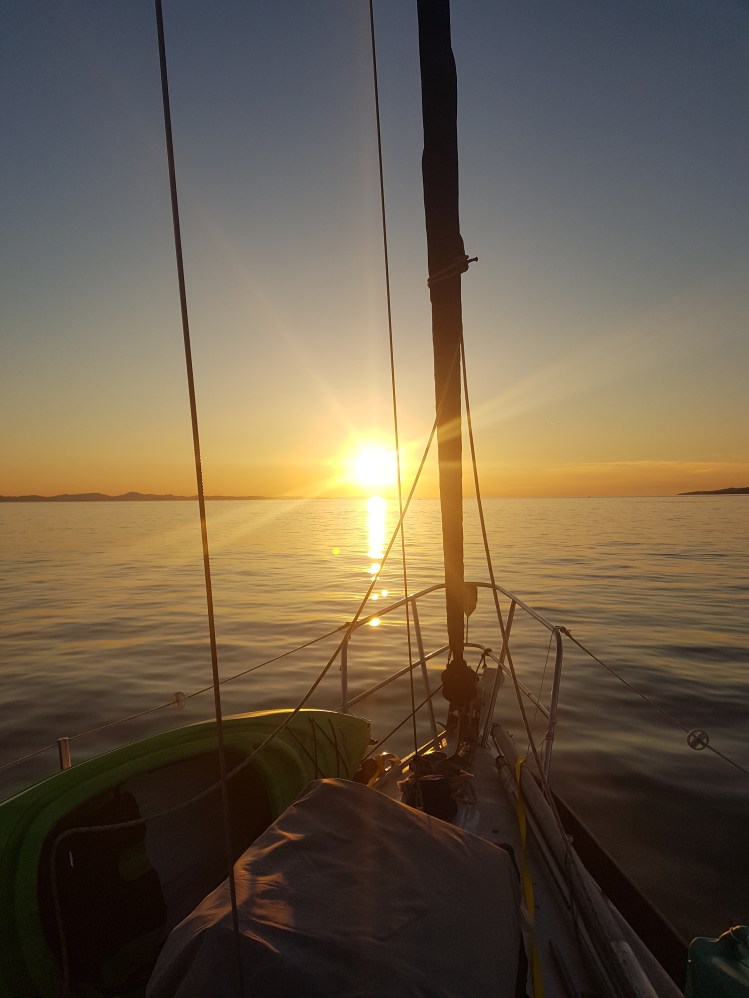 We were so not ready, truthfully the boat was so not ready (reef lines? Oh yeah, those were in the v-berth!). We pointed out into the Strait of Juan de Fuca determined to handle whatever was thrown at us, ready for a great sail (I mean we hadn’t actually even had the mainsail up this summer – we were READY to sail!) and psyching ourselves up for the first night…. and we found NO wind… not even a bit. So we motored, for hours. Finally, as dark fell, we found the slightest bit of breeze and were able to ghost along with only the jib out, doing about 2.5 knots.