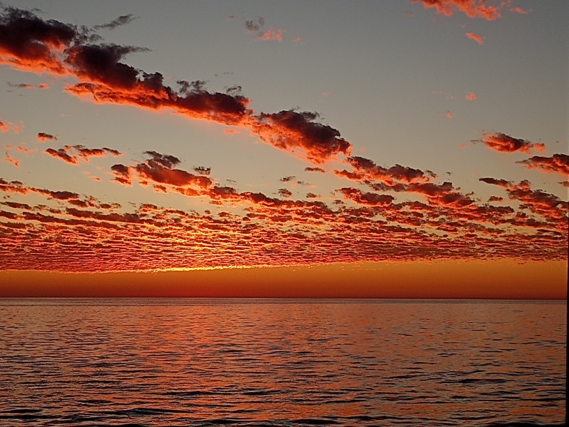 We had a slow first few days of sailing – we were sailing into headwinds, waves and current and it felt like we were pulling a trailer behind us. Those days were challenging in every regard – our tummies were doing backflips, the motion was relentless – my bruises have bruises, and on the first full day out I decided to take advantage of the light winds and a period of relatively calm conditions and prepare the fixings for a frittata – I was frying up the bacon and the grease in the pan just exploded – my hand was deep fried, there was bacon grease all over the stove top, down the front of the cupboard, on the floor and even down the hall to our berth – it was not a promising start!!!