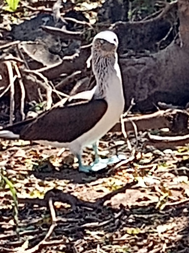 Once we managed to find our way over to the East Beach we discovered the little characters. They appear to nest on the ground – we had to walk around one mamma who fluffed herself out and gave us a bit of a talking to. We found little groups of them just wandering around with their gorgeous blue feet – there is something so cute and communal about them. I joked that the group of four of them that were tucked in under a tree were probably the dads, taking a break from getting squawked at by the mammas – they literally looked like a group of guys at the pub!!! We just crouched down and watched them for a half hour or so and then decided we had interrupted their day enough. After some celebratory high fives and a happy dance by me, we made our way back to the south end, and our awaiting dinghy. We headed back out to the boat, got the dinghy up and were back underway by early evening.