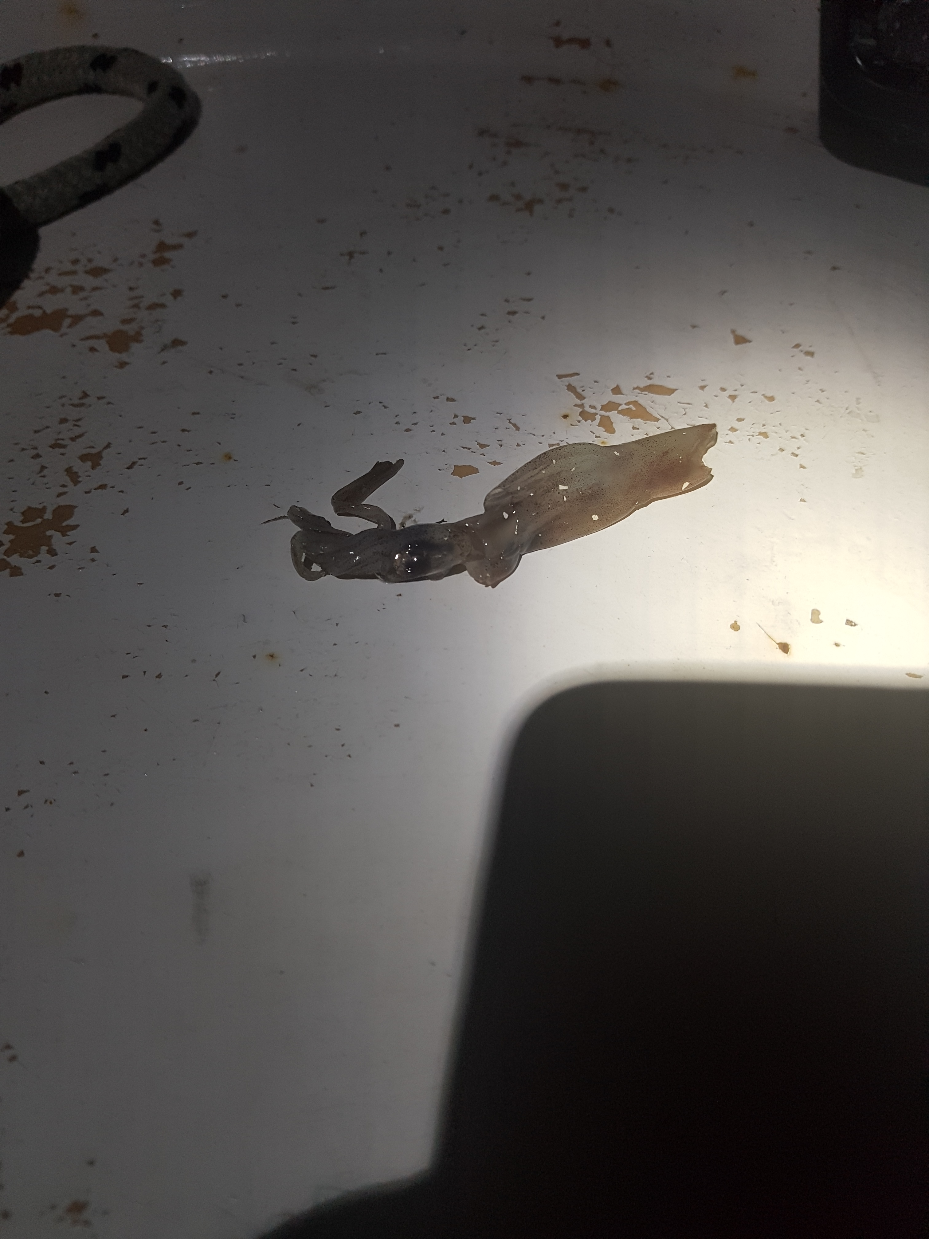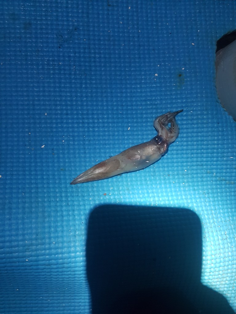 Owen was just getting settled in for his off-watch while I was tucked in in the cockpit with blankies and my podcasts – I felt around on the bench beside me to find my phone, to confirm that our heading was good – I grabbed what I thought was the end of the traveler line – it was pretty wet and soggy and I kind of rolled it through my fingers thinking “wow – did we ever get doused earlier!” – suddenly, it occurred to me that what was in my hand did not feel like rope – in fact it felt pretty slimy – ummmm – I put my hand up into the light of the chart plotter and realized I had some sort of sea creature in my hand! Screaming ensued – I rushed down the ladder and into the head, yelling “flying fish on my hand, flying fish on my hand!!” Owen, who was just trying to get himself wedged onto the settee grabbed a flashlight and shone it up in the cockpit – of course laughing at me while I scrubbed the skin off my hands – there was actually a squid still sitting where I had dropped it beside my seat, and another on the floor. He dispatched those two into the sea – the next morning we found another one on the deck and the day after that found one we had missed – it had been a bit wedged under the pole – it did not smell good when Owen scraped it off the deck!!! I can’t help but shudder to think that I could very well have taken one of those in the face during that big wave!!! Ewwwww
