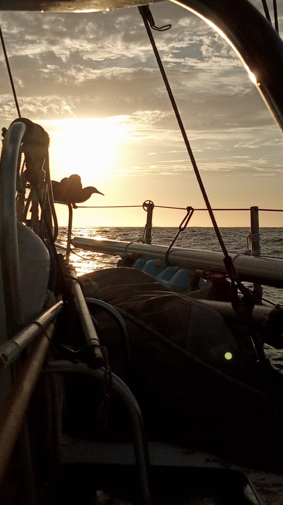 One of our first mornings I came on deck and was informed we had some stowaways – an entire flock of brown footed boobies had taken up residence on our bow pulpit – at one point there were 10 of them – we let them hitch a ride for about 24 hours and then – seeing the state of poop on our deck, we decided they should go!! We now find ourselves having to scare them off as they look to come in for a landing – a few of them snuck onto the rear solar panel our last night – and were not so easy to scare off – the mess is just not worth the entertainment!